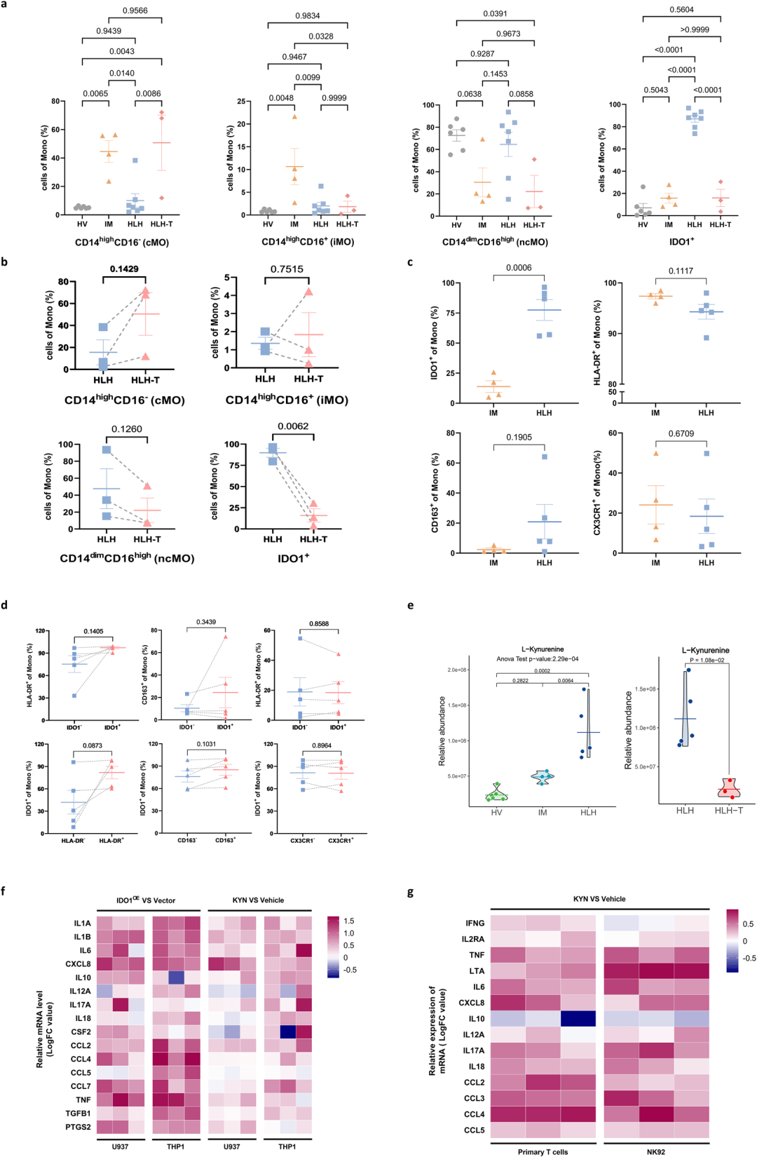 对独立验证队列样本外周血进行流式细胞术分析,HLH组IDO1+单核细胞的比例显著高于其他组(图5a-b)。IDO1是将色氨酸代谢为犬尿氨酸的关键限速酶。色氨酸靶向代谢组分析发现,IDO1的代谢产物L-犬尿氨酸在HLH组浓度显著升高,而在HLH-T组中则有所下降(图5e)。在THP1和U937细胞中进行IDO1过表达和外源性犬尿氨酸(KYN)补充实验,qRT-PCR分析证实,KYN显著上调了这些单核细胞中促炎细胞因子的表达水平(图5f),外源性KYN刺激也增强了原代T细胞和NK92细胞的促炎反应(图5g)。