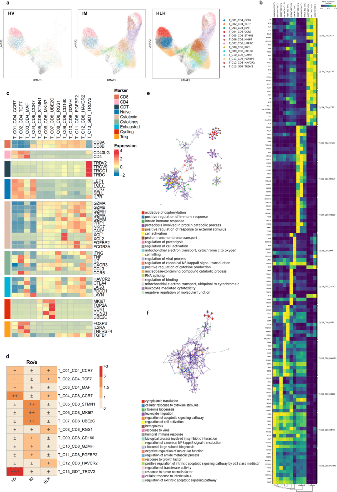 对三个组T细胞数据重新聚类,得到13个细胞簇。与HV组相比,HLH组主要富集于氧化磷酸化、细胞杀伤、NF-κB信号转导等过程;与IM组相比,HLH组主要富集于白细胞迁移、凋亡信号通路以及NF-κB信号转导等过程(图2d-f)。