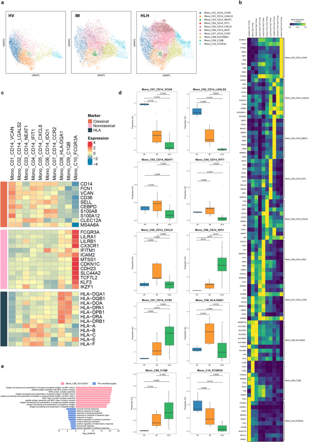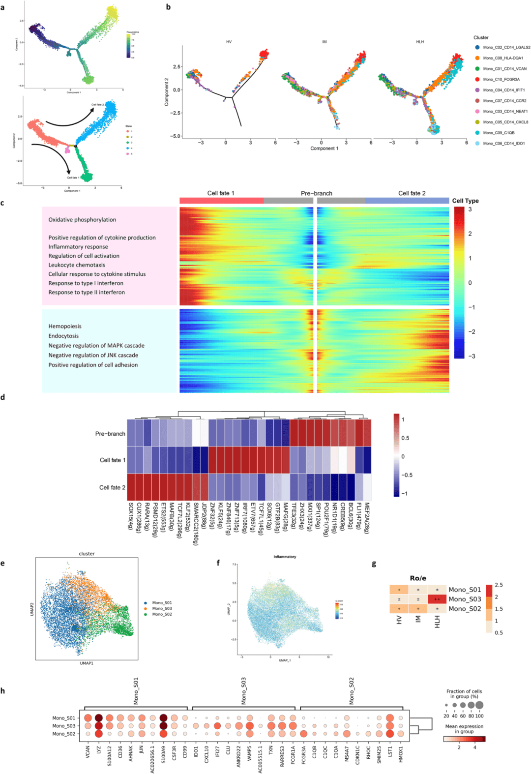 拟时序分析将单核细胞分化为两个不同的分支,其中fate1主要存在于HLH中,而Mono_C06_CD14_IDO1细胞则在fate1的末端聚集,表明这种分化路径具有疾病特异性。IDO1、IL18等基因沿着fate1方向逐渐上调,与炎症反应和细胞因子生成的正向调节有关(图4a-c)。UMAP图中fate1的单核细胞亚群定义为Mono_S03,其中IDO1的表达量非常高(图4d-h)。