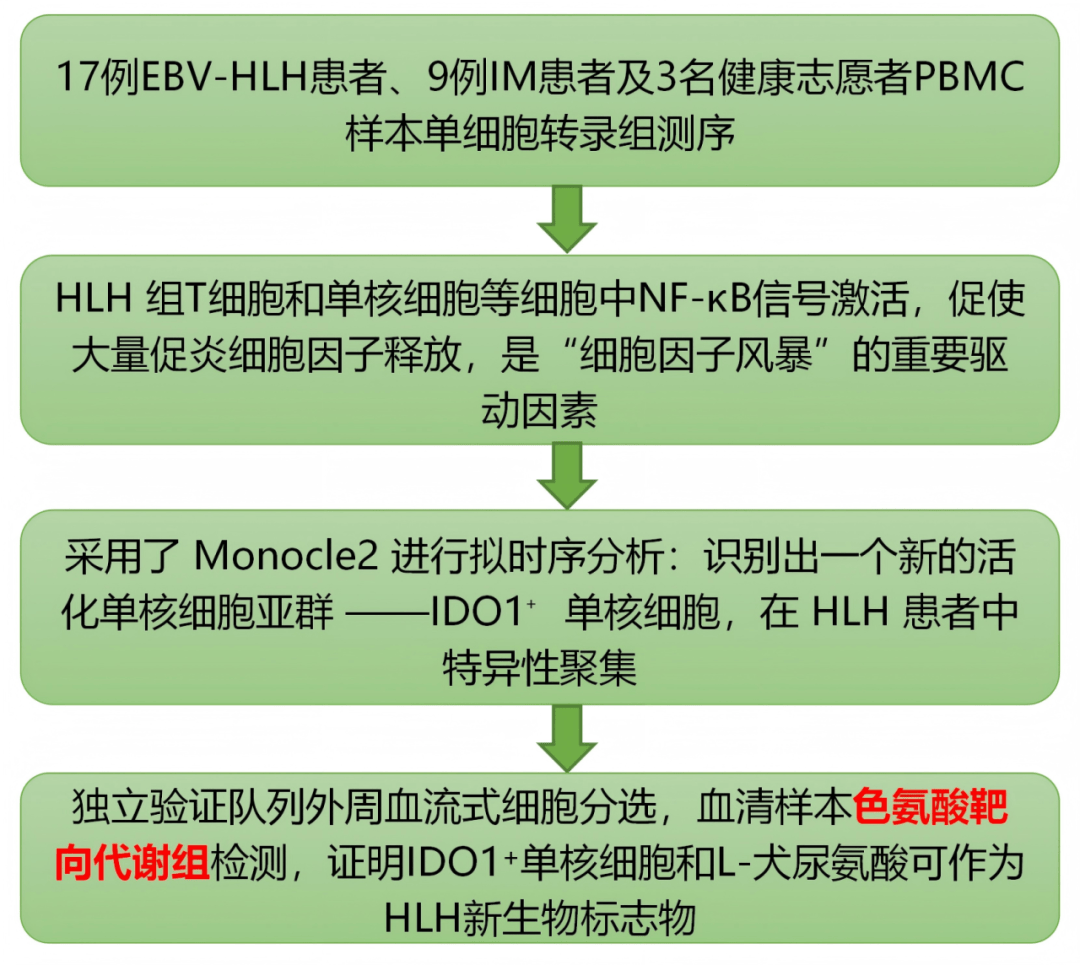 本研究绘制了儿童EB病毒相关噬血细胞性淋巴组织细胞增多症(EBV-HLH)的免疫图谱,揭示了这一致命性疾病的发病机制,并发现IDO1⁺单核细胞及代谢产物L-犬尿氨酸可作为潜在生物标志物,为疾病早期诊断和靶向治疗提供了重要依据。