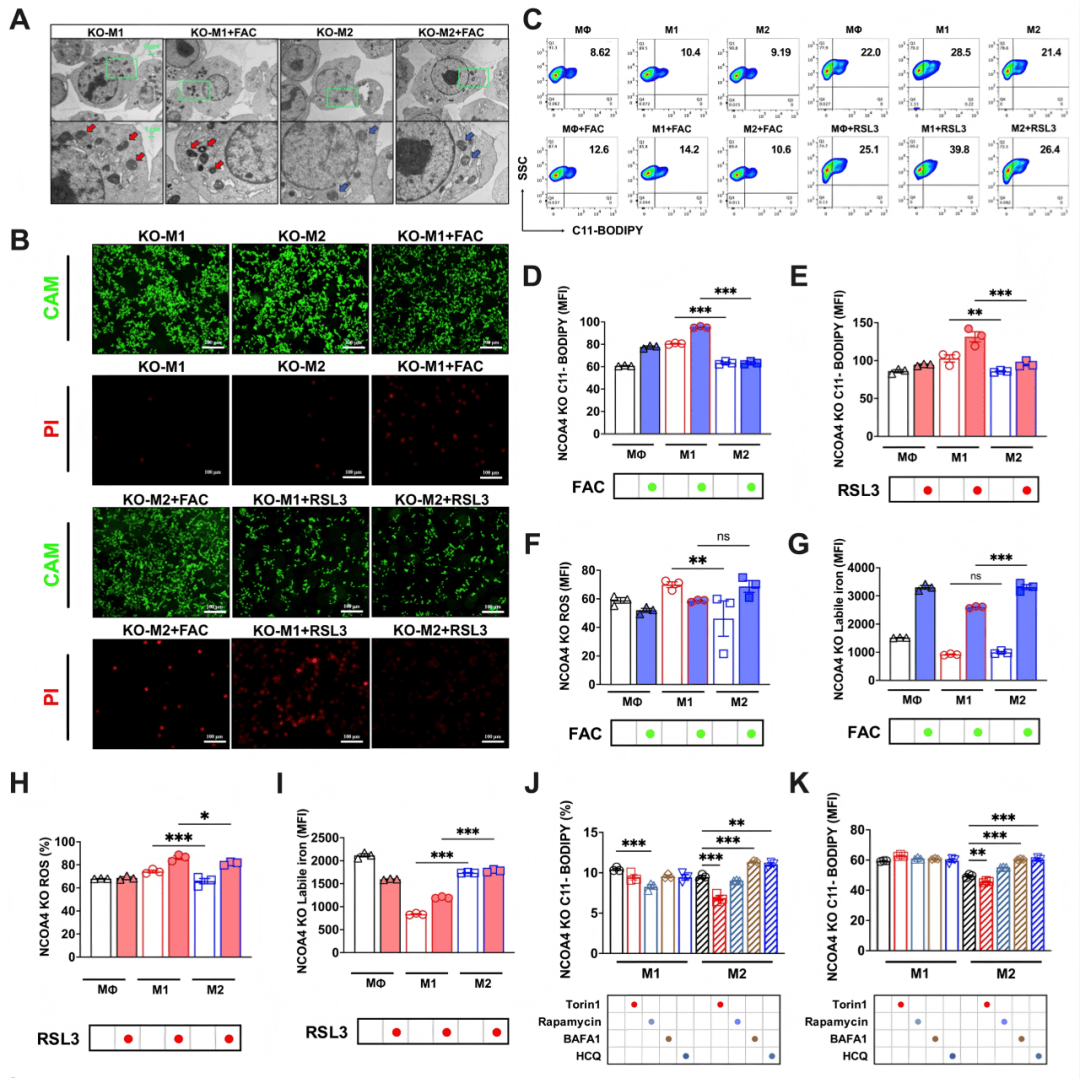 铁蛋白与核受体共激活因子4(NCOA4),以一种称为铁蛋白吞噬11的特殊自噬形式靶向溶酶体降解。结合前期实验结果表明M2 BMDM巨噬细胞由于自噬增加和完全自噬,经历了FTH/L降解,导致高不稳定的铁水平和对铁死亡的抵抗力降低。FTH/L对BMDM和脾脏巨噬细胞之间自噬调节的敏感性不同,这可能是铁死亡敏感性差异的基础。鉴于铁蛋白噬菌在确定BMDM对铁死亡的敏感性方面可能起的作用,对NCOA4进行敲除,FAC处理下M1和M2巨噬细胞中的NCOA4敲除均未产生显著的细胞形态学差异(图2A)。在FAC和RSL3处理下,M1多于M2 PI阳性死细胞(图2B),M1巨噬细胞表现出显著更高的脂质过氧化(图2C-E)和总ROS水平(图2F-H)比M2巨噬细胞。此外,自噬抑制剂未能减少NCOA4敲除的M2巨噬细胞中的脂质过氧化(图2J-K)。这说明了敲除关键铁蛋白噬蛋白后,M1和M2巨噬细胞对铁死亡的敏感性逆转,M1巨噬细胞表现出较差的抵抗力。