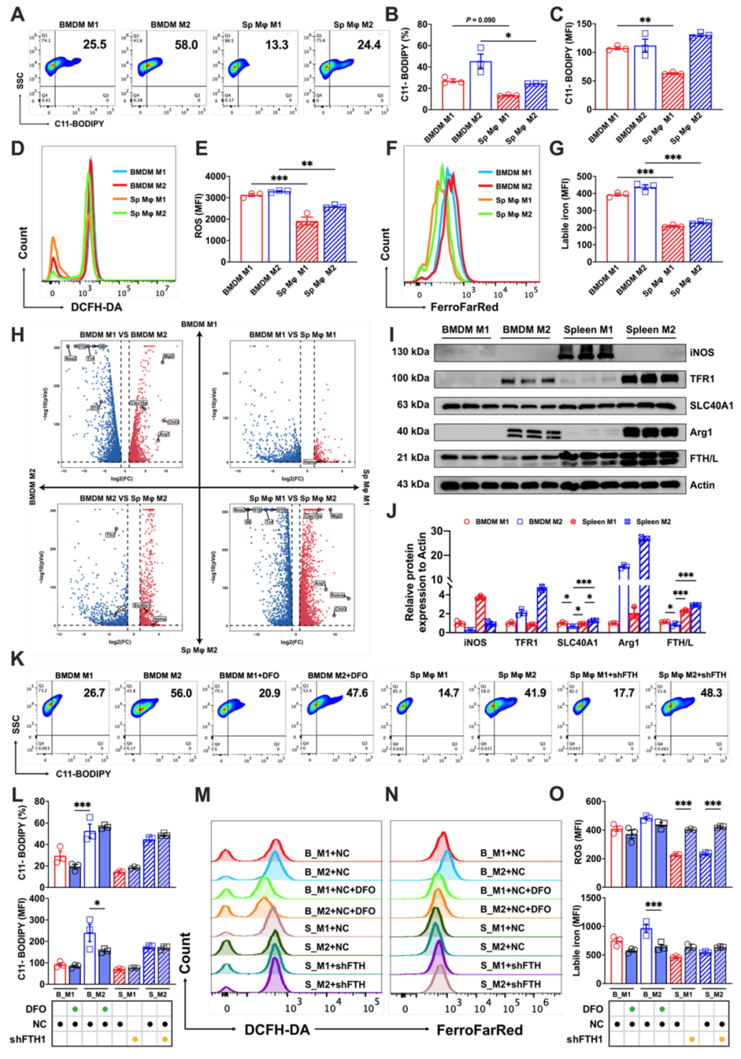 进一步探索组织巨噬细胞中不同程度的铁死亡抗性,对极化脾巨噬细胞和BMDM进行比较分析显示,脂质过氧化(图1A-C)、ROS水平(图1D和E)和不稳定铁水平低于骨髓对应物(图1F-G)。转录组学分析发现铁代谢相关基因(Slc40a1、Hamp和Tfrc)表达存在差异(图1H)。脾脏巨噬细胞的SLC40A1(铁输出)和FTH/L(铁储存)表达显著高于BMDMs,且BMDM M2的FTH/L表达最低(图1I-J)。DFO(模拟SLC40A1功能增强,增加铁输出)处理显著降低了脂质过氧化(图1K-L)和不稳定的铁水平,而FTH减少的巨噬细胞在M1和M2脾脏巨噬细胞中均显示细胞内总ROS显著升高(图1M-O)。这些结果表明,BMDM,尤其是M2巨噬细胞的铁死亡敏感性升高归因于其不稳定铁水平升高以及FTH/L和SLC40A1表达降低。