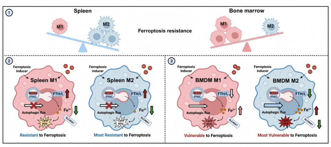 本研究通过体内分析显示,骨髓M2巨噬细胞最易发生铁死亡,其次是骨髓M1、脾脏M1和脾脏M2巨噬细胞。在脾脏巨噬细胞中,自噬通量受损和铁调节剂(如SLC40A1和FTH/L)的表达增强有助于降低不稳定的铁水平,从而增加对铁死亡的抵抗力。相比之下,骨髓M2巨噬细胞的特征是高自噬通量和铁蛋白自噬介导的FTH/L降解,积累了更不稳定的铁,使它们更容易发生铁死亡(图3)。这些发现凸显了巨噬细胞铁代谢、自噬和铁死亡抗性之间复杂的相互作用,强调了组织特异性因素在铁超载条件下塑造免疫反应的重要性。