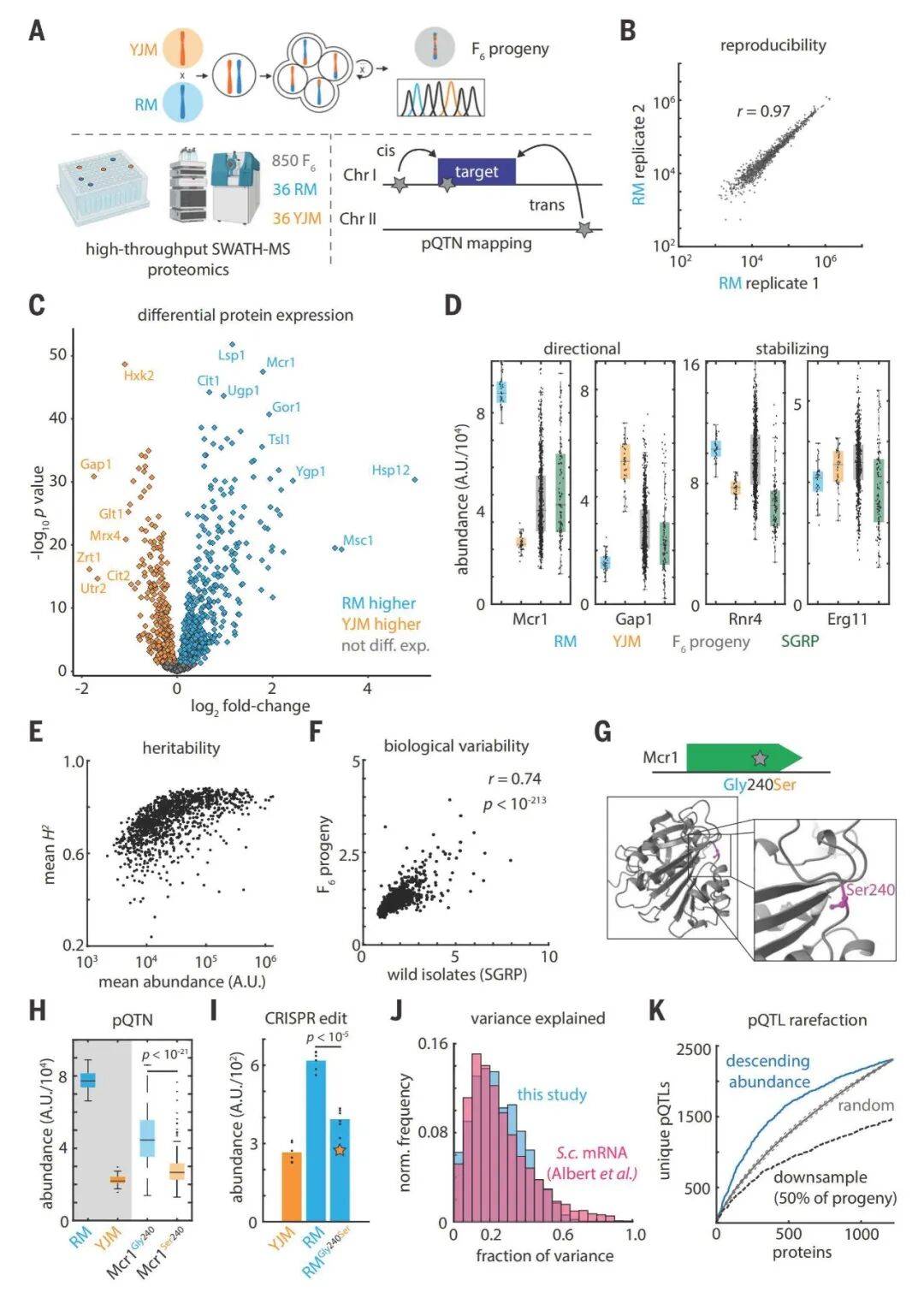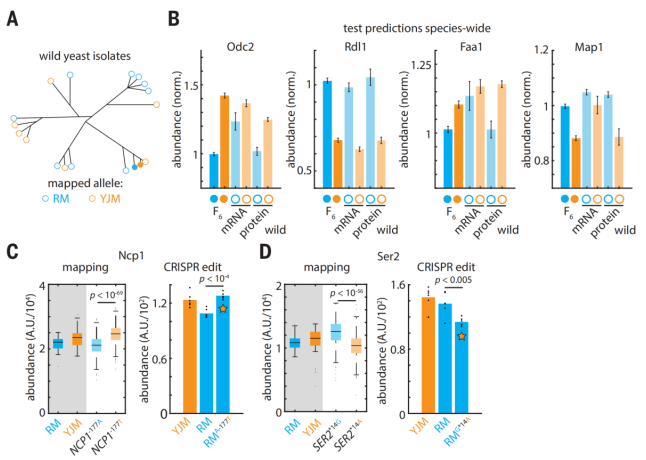蛋白质组学分析共鉴定出6476个蛋白质数量性状位点(pQTLs),它们控制着923个蛋白质的丰度,其中1650个pQTLs(占比25.5%)可精细定位到单个核苷酸多态性,达到“核苷酸分辨率”(图1G-K);该图谱对蛋白质丰度整体方差的解释率达22.8%,与酵母mRNA水平的数量性状位点(eQTL)图谱解释力相当,且通过CRISPR基因编辑可直接验证单个pQTN的调控效应,证明图谱的准确性与可靠性(图2A-D)。