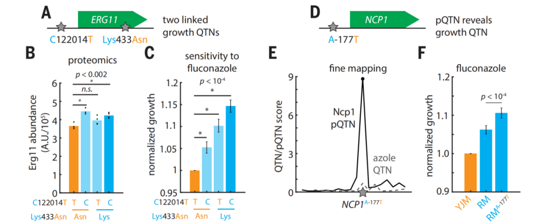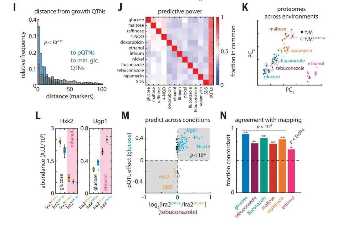 尽管图谱是在标准无胁迫条件下构建的,但其中的pQTLs可跨环境预测遗传变异的表型效应——例如,ERG11基因的两个变异(调控型C122014C与错义型Lys433Asn)可通过图谱预测其对氟康唑(抗真菌药物)敏感性的影响,且CRISPR验证显示两者协同降低敏感性(图5A-F);此外,跨环境分析发现,78%的胁迫抗性QTL(如抗药物、抗金属胁迫)与pQTL共定位,远高于胁迫条件间QTL的共定位率(48%),证明蛋白质组是“潜在分子层”,可提前揭示遗传变异在未发生胁迫时的表型潜力(图6J-L)。