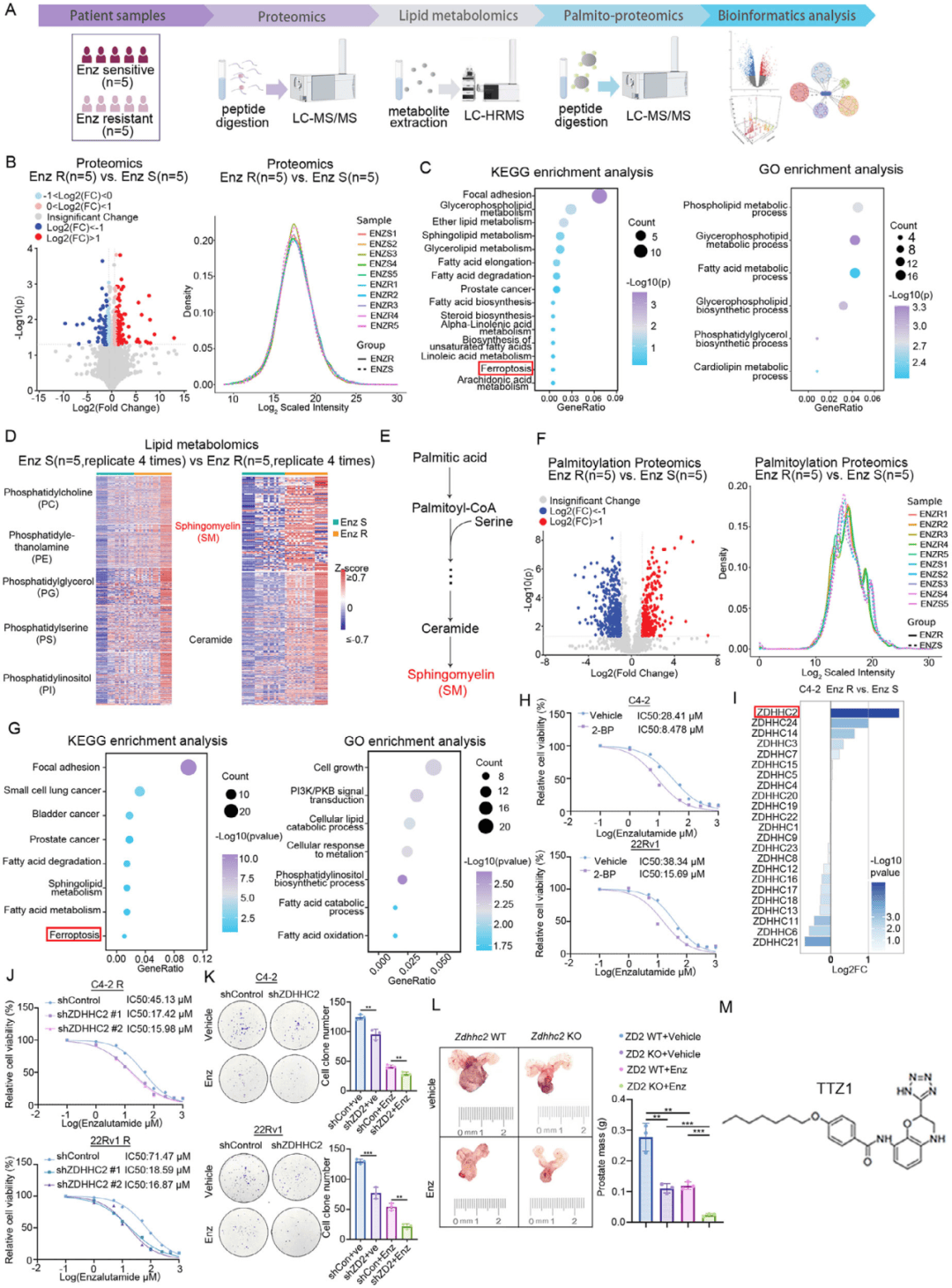 蛋白组、脂质组、棕榈酰化修饰组分析发现:耐药样本中棕榈酸水平显著升高,且棕榈酰化修饰模式与敏感样本差异显著(图1E-F);棕榈酰化差异蛋白富集于铁死亡、脂质代谢等通路(图1G);转录组数据显示,ZDHHC2是ZDHHC家族中在耐药细胞中上调最显著的成员(图1I)。ZDHHC2敲低可显著逆转C4-2/22Rv1耐药细胞对恩杂鲁胺的耐药性(图1J-K),过表达则促进敏感细胞耐药;ZDHHC2的酶活突变体(C129A)无法促进耐药,证明其作用依赖棕榈酰转移酶活性;泛棕榈酰化抑制剂(2-BP)可增强恩杂鲁胺在细胞及PDX模型中的敏感性(图1H)。