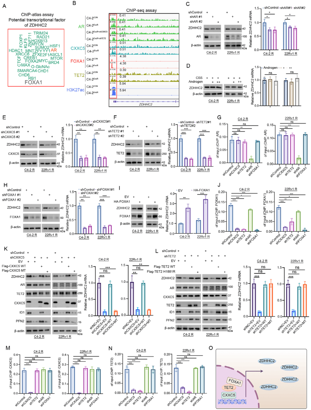 通过ChIP-Atlas发现FOXA1、AR等可能调控ZDHHC2,ChIP-seq显示FOXA1在ZDHHC2启动子的占据率显著升高,而AR无差异(图2A-B);敲低FOXA1、CXXC5或TET2均显著降低ZDHHC2的mRNA及蛋白水平(图2E-H),过表达FOXA1则上调ZDHHC2(图2I);CXXC5需结合TET2才能调控ZDHHC2,且TET2作用不依赖其酶活(图2K-L);且发现FOXA1/CXXC5/TET2复合物通过增强ZDHHC2启动子区H3K27ac水平,转录上调ZDHHC2(图2O)。