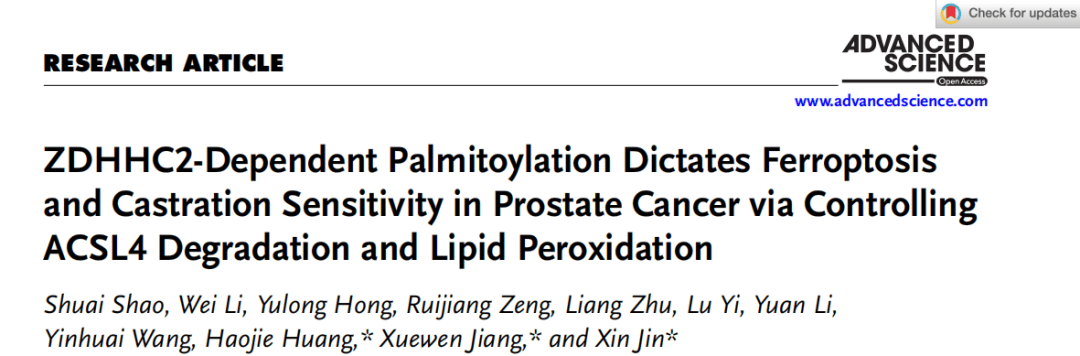 2025年10月23日,中南大学/山大齐鲁/浙江大学合作在Advanced Science上发表题为“ZDHHC2-Dependent Palmitoylation Dictates Ferroptosis and Castration Sensitivity in Prostate Cancer via Controlling ACSL4 Degradation and Lipid Peroxidation”的研究文章。首次揭示棕榈酰化通过调控脂质过氧化产生通路影响铁死亡,确立ZDHHC2为CRPC恩杂鲁胺耐药的关键靶点,为临床干预提供新方向。