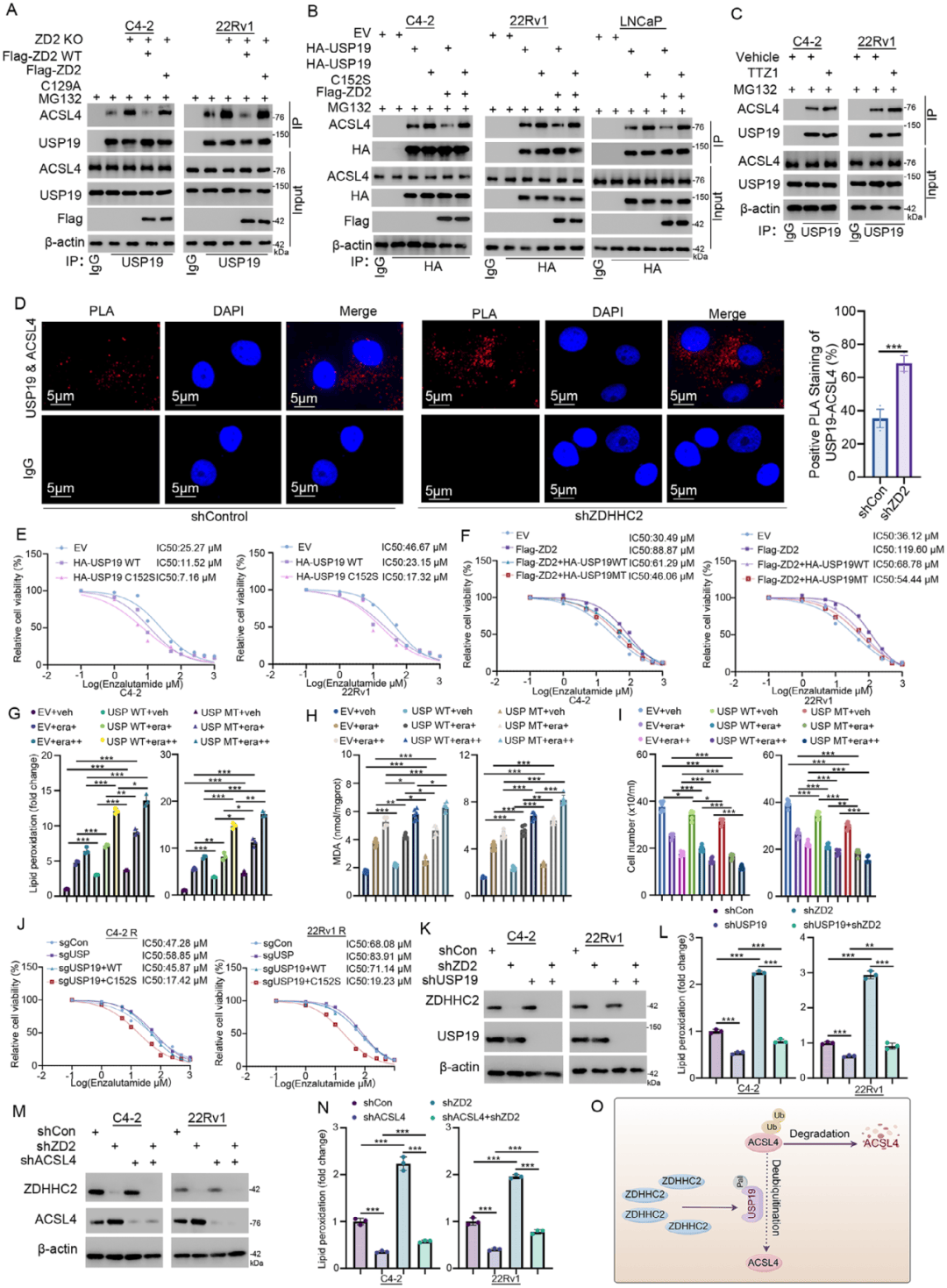 ZDHHC2过表达可减少USP19与ACSL4的相互作用,TTZ1处理或ZDHHC2敲除则增强该作用(图6A-C);USP19C152S突变体与ACSL4结合更强,可显著增强铁死亡、提升恩杂鲁胺敏感性(图6G-J);USP19或ACSL4敲低可逆转ZDHHC2敲低介导的铁死亡激活,证明ZDHHC2→USP19→ACSL4轴的特异性(图6K-N)。