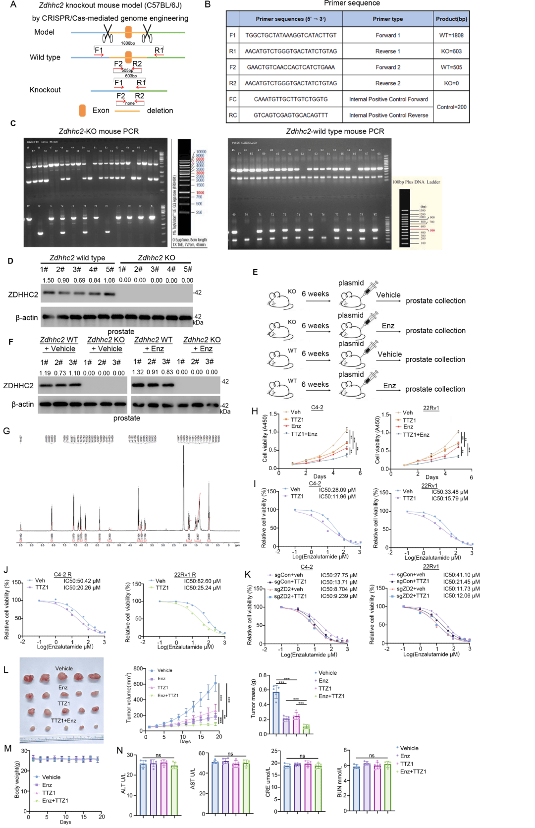 ZDHHC2敲除后,TTZ1不再影响ACSL4水平、铁死亡指标及恩杂鲁胺敏感性(图3P-Q、图7K);在C4-2/22Rv1敏感/耐药细胞及恩杂鲁胺耐药PDX模型中,TTZ1可显著恢复ACSL4水平、激活铁死亡、逆转耐药(图1M、图7H-L);且TTZ1与恩扎卢胺联合使用不影响小鼠体重、肝肾功能(图7M-N)。