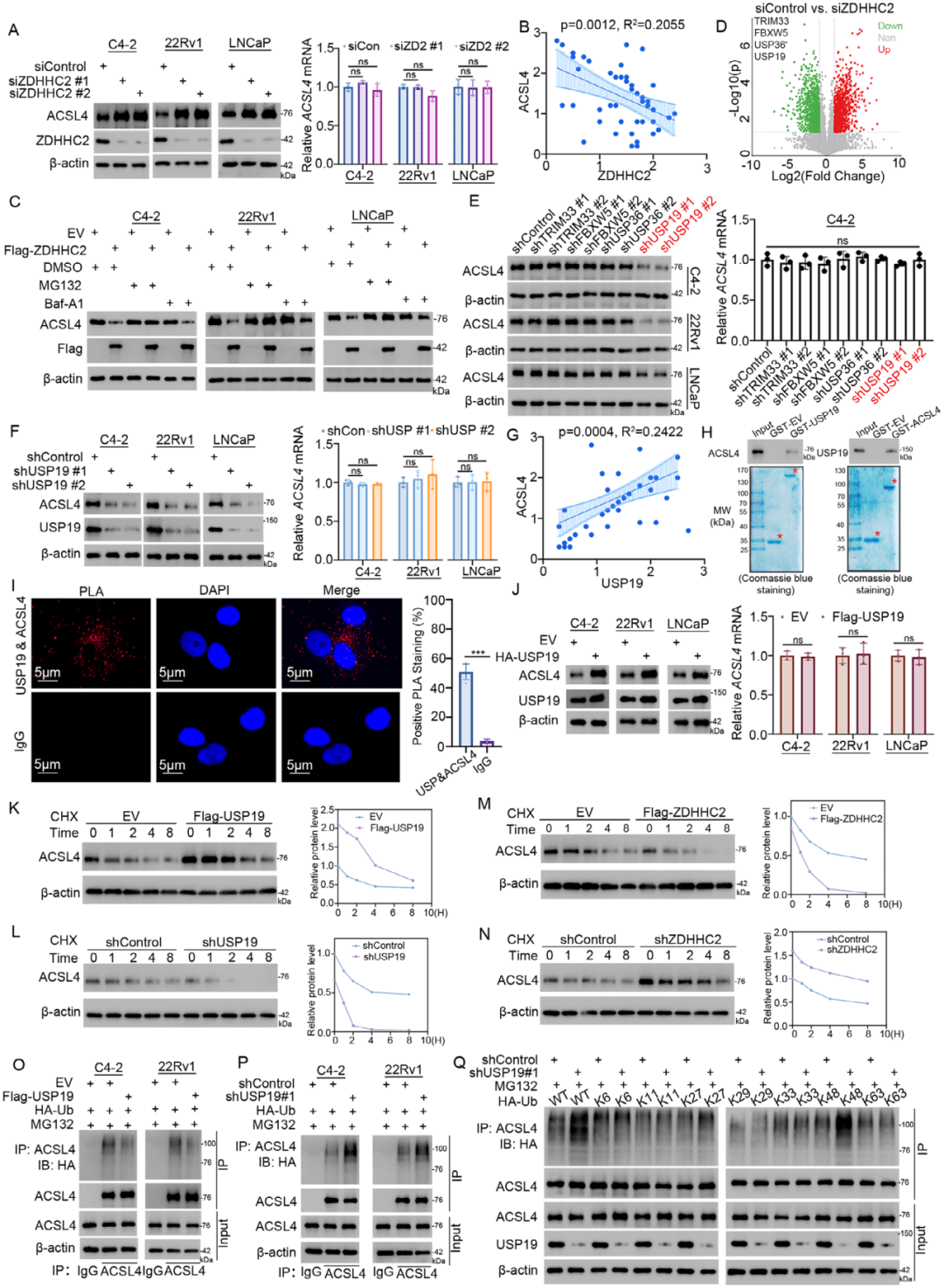 ZDHHC2仅影响ACSL4蛋白水平(不影响mRNA),泛素-蛋白酶体抑制剂(MG132)可逆转ACSL4降解,而自噬抑制剂(Baf-A1)无效,证明其调控依赖泛素化降解(图4A-C);棕榈酰化蛋白组筛选到4个泛素相关蛋白,仅敲低USP19可降低ACSL4蛋白水平(不影响mRNA)(图4D-F);USP19与ACSL4直接相互作用(GSTpull-down/PLA验证),通过抑制ACSL4的K48位泛素化延长其半衰期(图4H-I、4O-Q);前列腺癌组织芯片显示ACSL4与USP19蛋白水平正相关,与ZDHHC2负相关(图4B-G)。