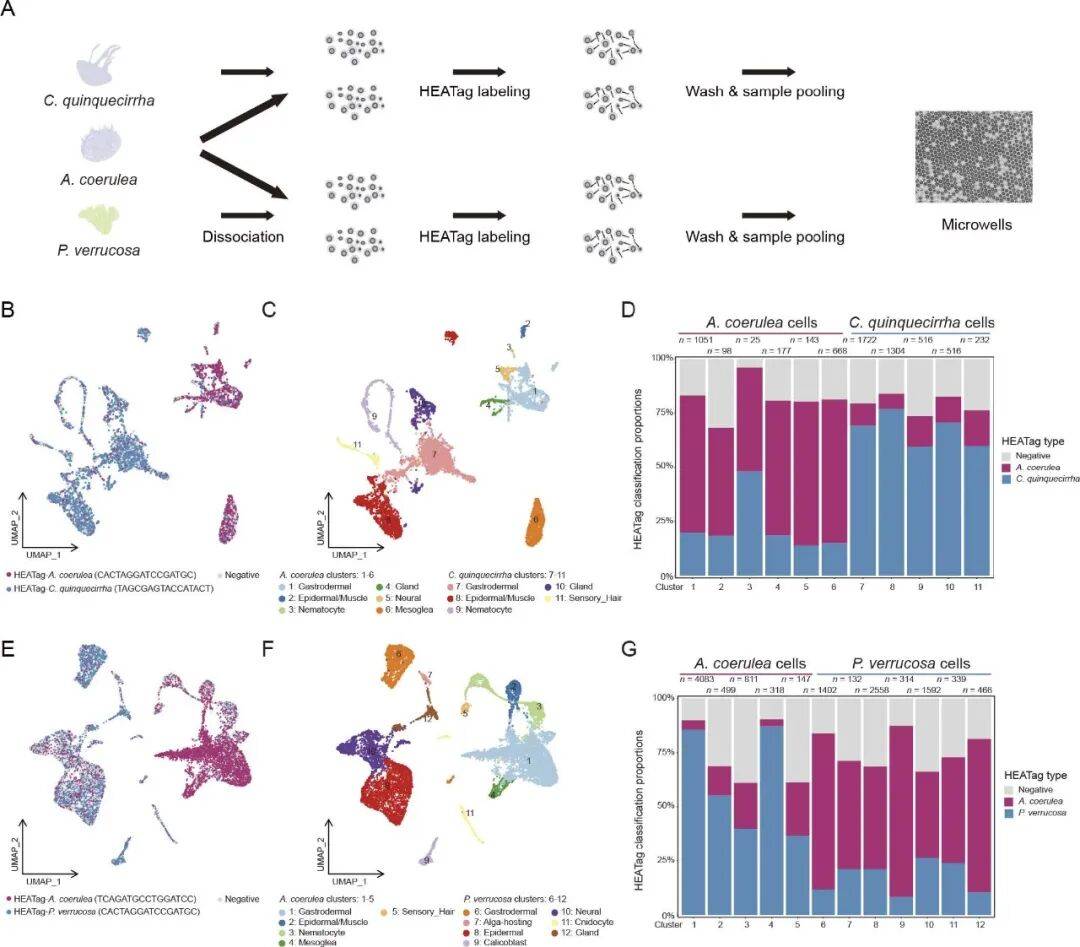 更令人惊喜的是HEATag对海洋生物的适配性。HEATag能在海水的等渗溶液中标记新鲜的海洋动物细胞(如海月水母、大西洋海刺水母)。研究人员用人工海水稀释的HEATag 标记了水母和珊瑚的组织细胞后在 BD Rhapsody 平台测序,最终回收的 6452 个细胞中,HEATag 条形码与物种转录组具有较高一致性,没有出现因高盐环境导致的 “标记失效”。后续对甲醇固定的海洋生物细胞测试结果显示,HEATag 在固定样本中的拆分效果优于新鲜样本。