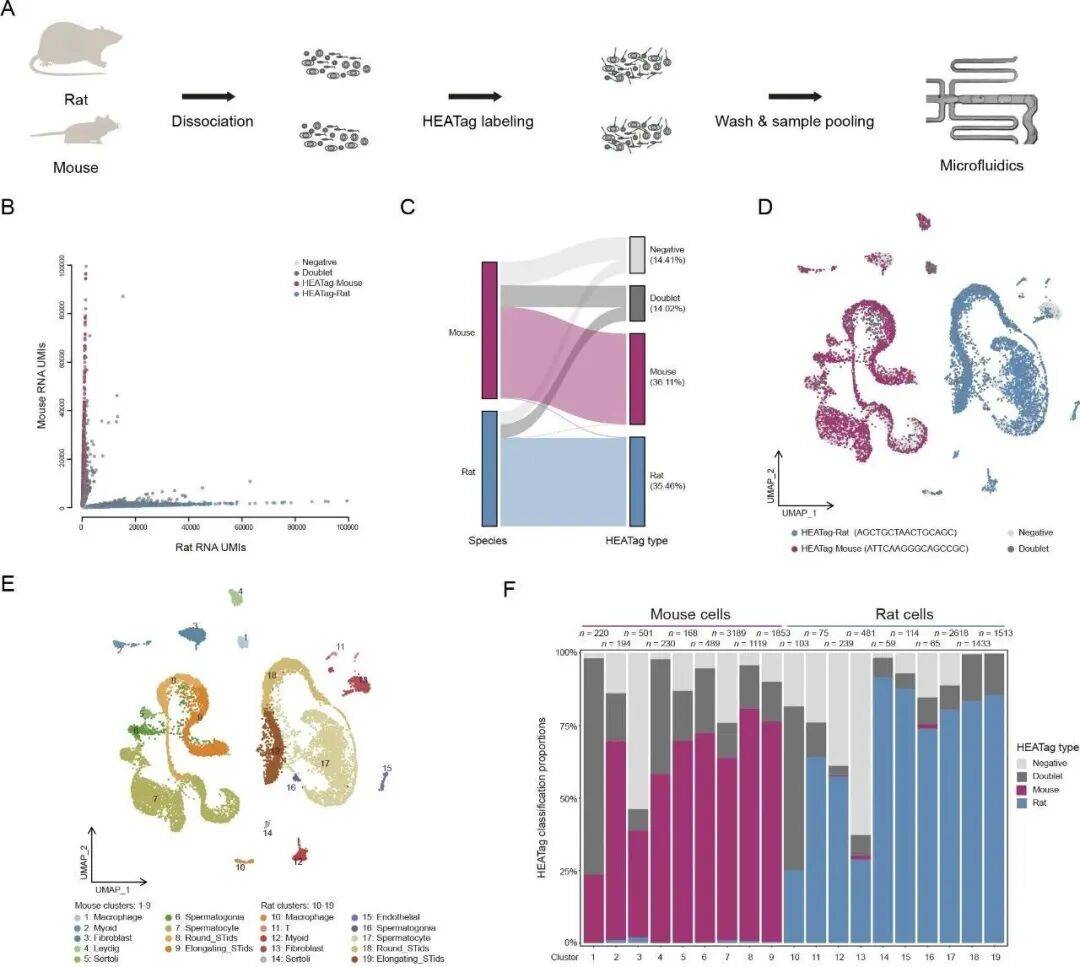 研究团队选择了大鼠和小鼠的睾丸组织,这类样本包含精原干细胞、精母细胞、精子细胞等多种类型,对标记一致性的要求极高。实验中,两种动物的睾丸用特异性 HEATag 条形码标记后混合测序,最终获得的 14663 个细胞不仅能被准确区分,所有主要细胞类型的聚类结果都清晰可辨。