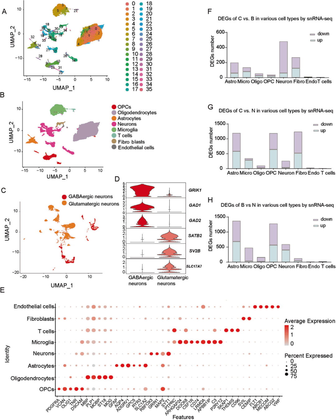 使用t-SNE或UMAP进行无监督聚类分析,并将细胞分成36个簇,揭示了样品中细胞类型和潜在细胞状态的多样性(图4A),随后利用已知细胞类型的特征性的已建立的标志物和基因集注释细胞(图4B,E)。神经元根据其已建立的标记进一步分为兴奋性神经元和抑制性神经元(图4C-D)。在三个组对的每种细胞类型中鉴定的差异表达基因的数量在图中示出(图4F-H)。