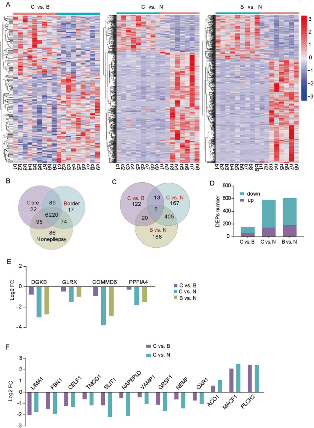 采集临床手术的非癫痫对照(N),边缘切除组织(B)和癫痫发作区(C)的大脑样本,通过DIA蛋白组发现差异蛋白,在C与B组间发现161个差异蛋白,B与N组间发现591个差异蛋白,B与N组间发现619个差异蛋白。在所有差异蛋白中,其中有6个是组间共有的(图1A-D)。PRM蛋白组进一步对组间差异蛋白进行验证,并在所有三对样品的比较(C与B、C与N、B与N)一致地鉴定出这些差异蛋白之一GLRX(图1E)。