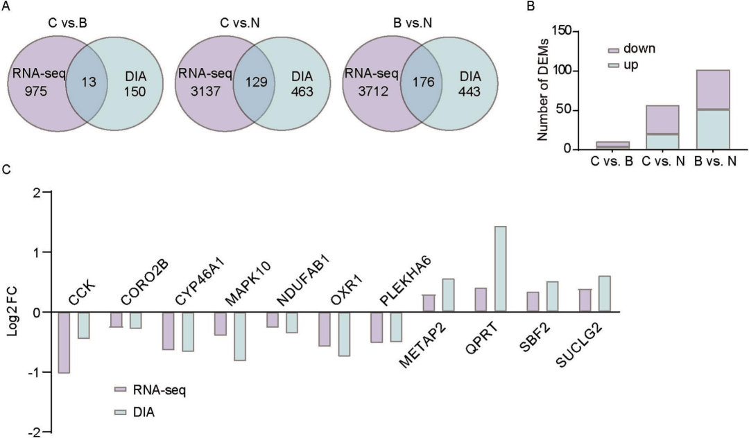 RNA-seq结果的聚类分析表明三个组之间有良好的区别(图2A)。整合转录组和蛋白组的差异分子,发现13个分子在C与B比较组中蛋白和转录表达均有显著差异,其中11个表达趋势一致(图3C)。