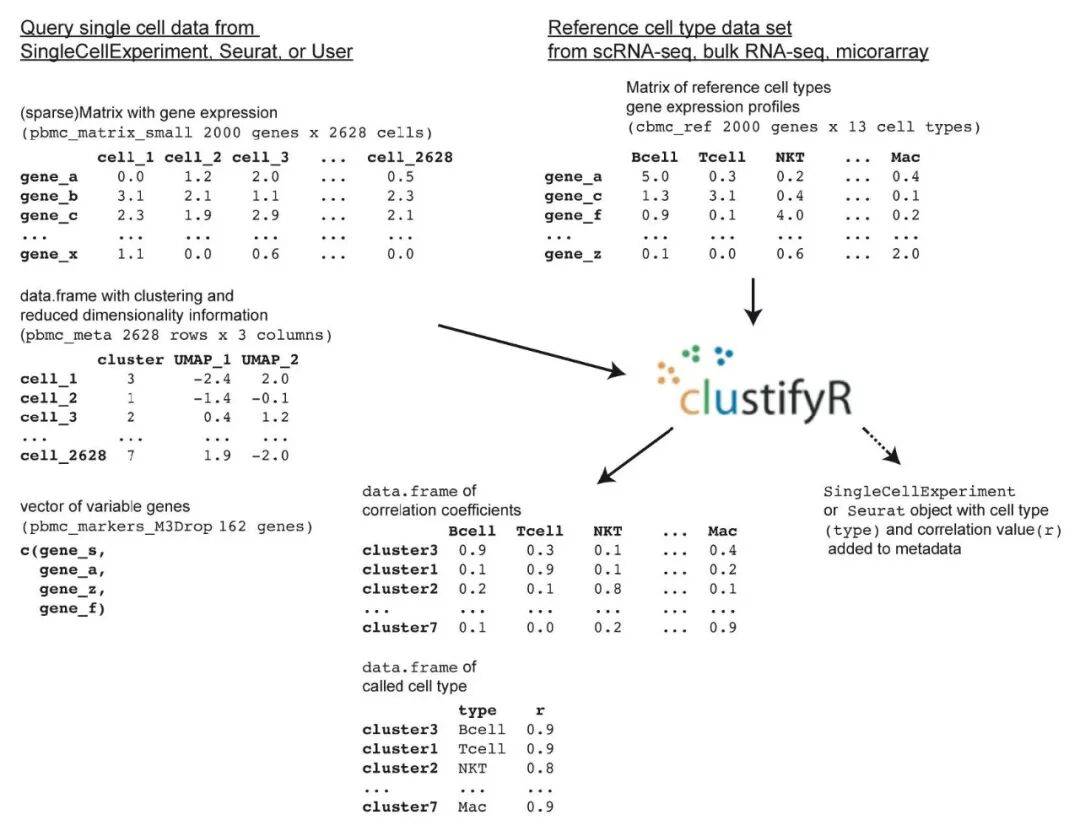 [3] Fu R, Gillen AE, Sheridan RM, et al. clustifyr: an R package for automated single-cell RNA sequencing cluster classification. F1000Res. 2020 Apr 1;9:223. doi: 10.12688/f1000research.22969.2. PMID: 32765839; PMCID: PMC7383722.