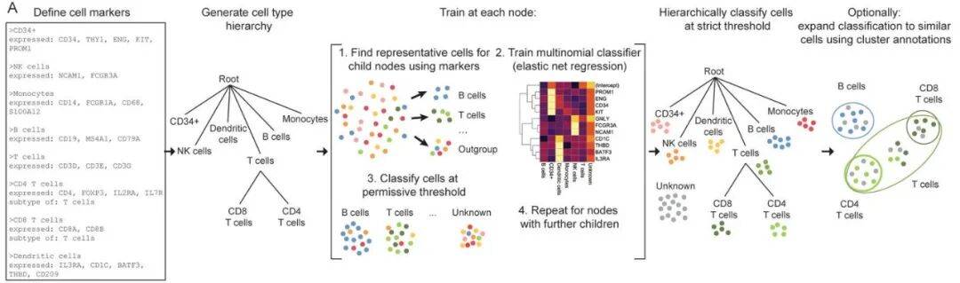 Garnett是一种基于可训练分类器的注释工具。其流程始于用户根据先验知识构建一个标记基因文件,以定义基本的细胞类型。随后,工具会运用弹性网络回归模型,以用户定义的标记为起点,在单细胞数据中进行迭代训练。该模型不仅能自动筛选和优化初始标记基因的权重,更能主动发掘数据中新的、有判别力的基因特征作为补充。最终生成的分类器,是一个融合了专家知识与数据驱动发现的强大模型,确保了注释的准确性与在同类数据集中的可移植性。