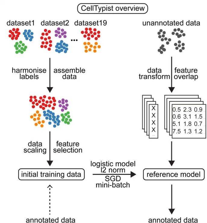 CellTypist是一款专为人体免疫细胞设计的高分辨率自动注释工具。其核心优势源于一个经过精心整理的庞大训练集,该集合成了来自多种人体组织的数百万个免疫细胞。基于此,CellTypist采用逻辑回归模型进行训练,并优化了基因权重,最终生成一个覆盖极其广泛(包括T细胞、B细胞、NK细胞、髓系细胞等)且细分至200余种细胞状态/亚型的分类器。此外,它还包含一项关键的“过半数投票”机制:当提供细胞聚类信息时,工具会统计每个聚类内所有细胞的预测结果,并将占比最高的细胞类型(须超过50%)指定为该聚类的共识标签。这一功能通过整合群体信息,有效提升了最终注释结果的稳健性和可解释性。