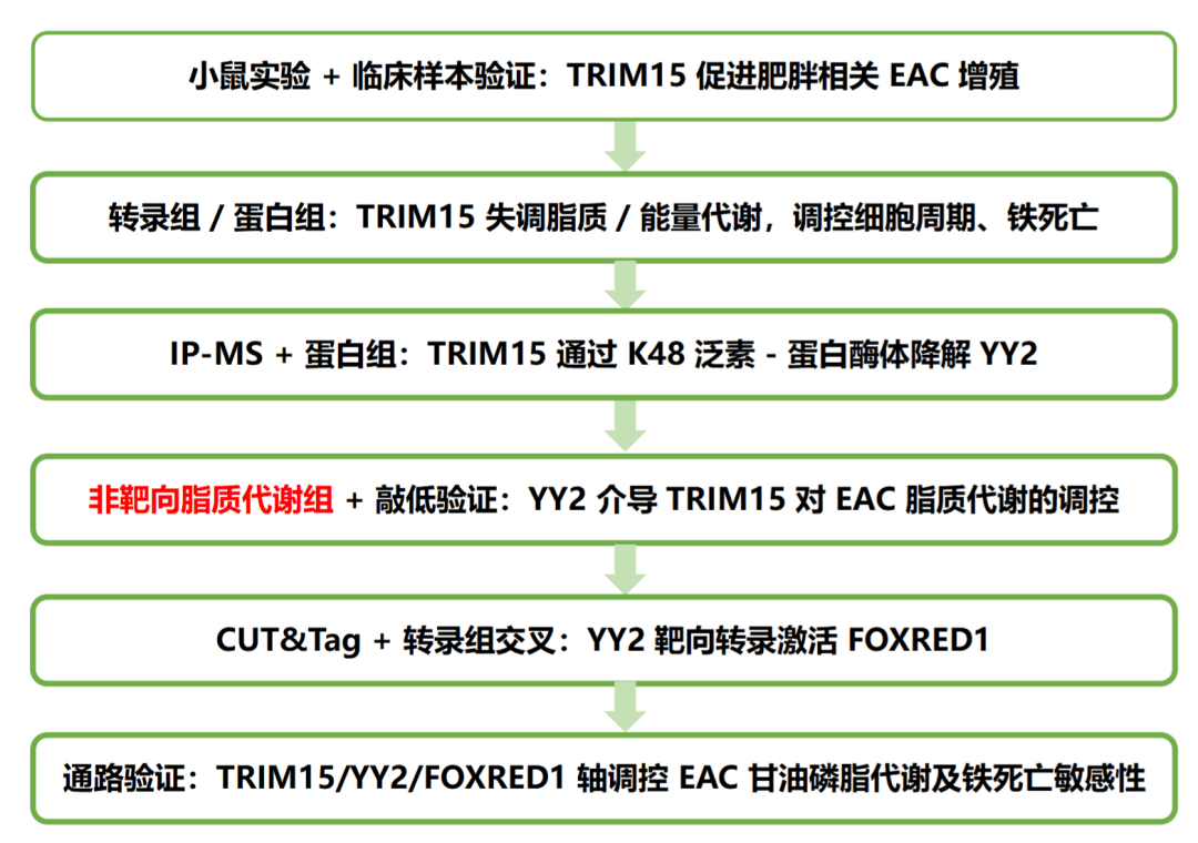 本研究通过多组学分析发现,肥胖相关EAC肿瘤组织中TRIM15表达显著上调,证实TRIM15通过降解YY2蛋白抑制FOXRED1表达,从而促进EAC细胞增殖。且进一步阐明TRIM15/YY2/FOXRED1轴抑制FOXRED1表达从而调控EAC细胞甘油磷脂代谢以及EAC细胞对铁死亡的敏感性。不仅为肥胖相关EAC的发病机制提供了新见解,还为EAC药物研发提供了理想候选靶点。