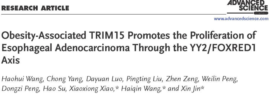 Wang, Haohui et al.“Obesity-Associated TRIM15 Promotes the Proliferation of Esophageal Adenocarcinoma Through the YY2/FOXRED1 Axis.” Advanced science (Weinheim, Baden-Wurttemberg, Germany), e17330. 14 Nov. 2025, doi:10.1002/advs.202417330
