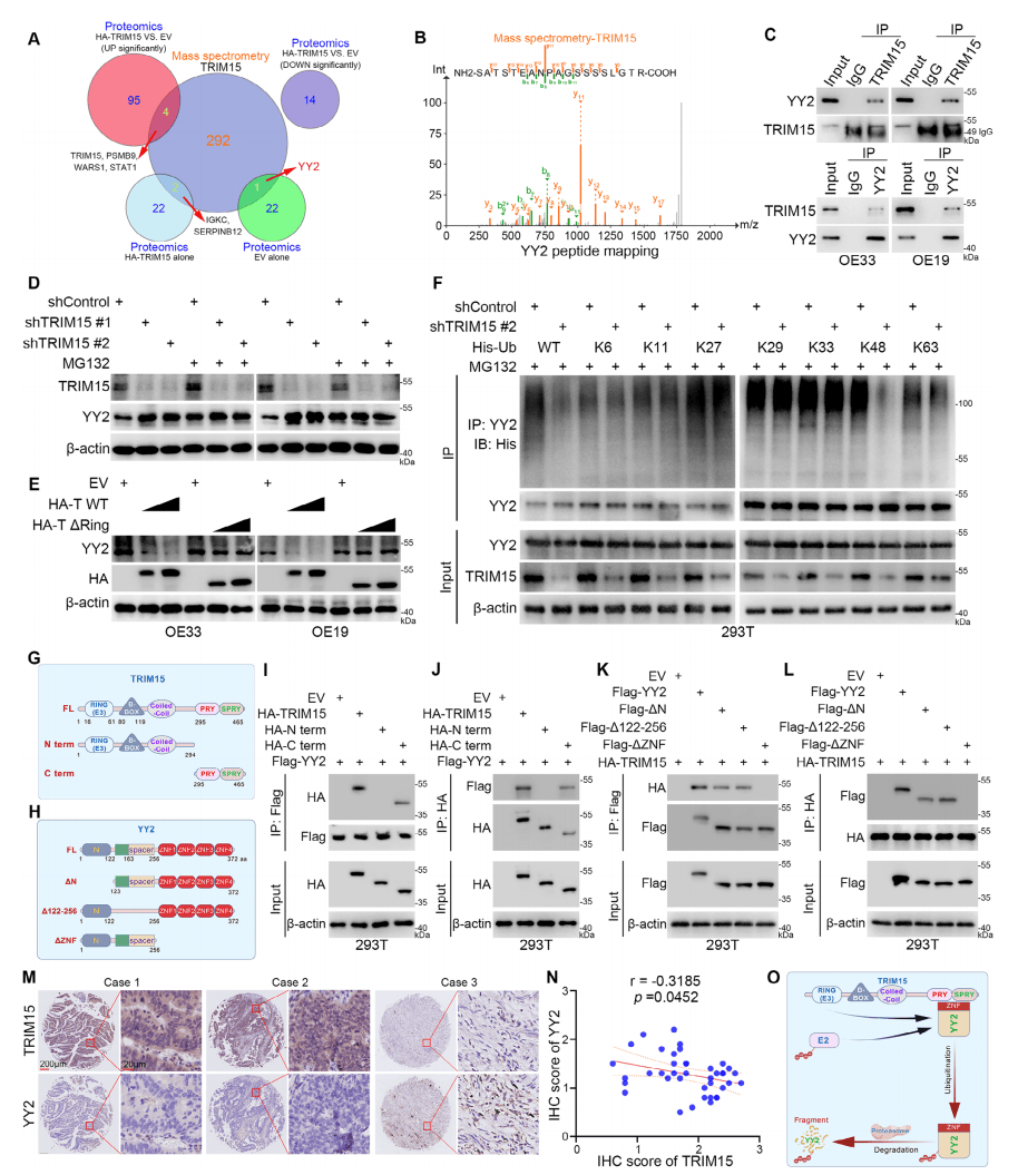 IP-MS与蛋白组差异结果交集鉴定7种蛋白,仅YY2为OE33细胞EV组独有(图3A-B)。EAC和293T细胞的IP及下拉实验证实TRIM15与YY2互作(图3C),敲低TRIM15升高YY2蛋白水平但不影响其mRNA,提示TRIM15调控YY2蛋白稳定性。MG132处理显著减弱TRIM15对YY2蛋白的影响(图3D),且TRIM15敲低降低293T细胞中YY2的总泛素化及K48连接泛素化(图3F)。截短突变体免疫共沉淀实验显示,TRIM15的C端区域与YY2的ZNF区域是二者互作的关键(图3G-L)。