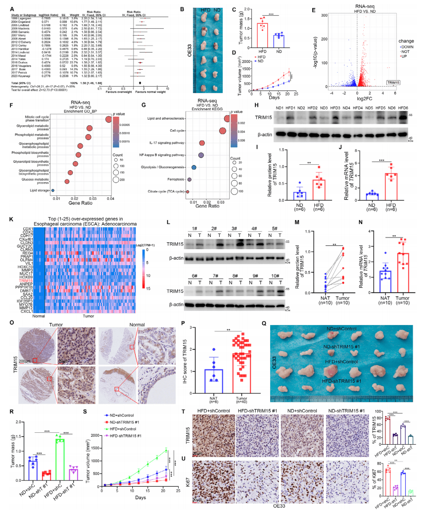 将EAC细胞皮下注射到HFD或ND喂养8周的小鼠体内,3周后,HFD组小鼠皮下肿瘤质量与体积显著更大(图1B-D),异种移植瘤转录组显示,与ND组相比,HFD组的脂质代谢、能量代谢和NF-κB通路显著失调,且HFD组中TRIM15的差异倍数变化最高(图1E-J)。临床组织样本免疫组化验证:EAC肿瘤组织中TRIM15的表达升高(图1L-P)。构建TRIM15敲低EAC细胞系,异种移植实验显示敲低组皮下肿瘤质量与体积显著减少,且IHC分析表明TRIM15敲低显著抑制了细胞增殖标志物Ki67的表达(图1T-U)。