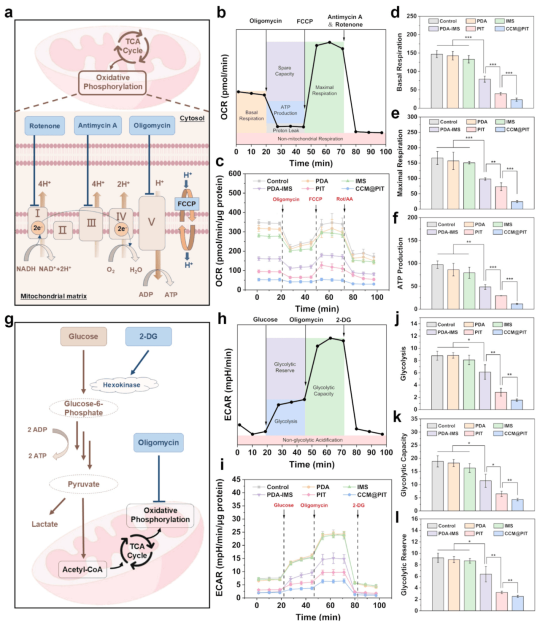 为了评估线粒体的功能,本研究通过Seahorse实验揭示CCM@PIT能够显著抑制OXPHOS途径和阻断能量供应(图4)。