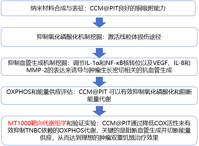 本文构建了用于TNBC治疗的具有精确线粒体靶向和高选择性吸附Cu2+的CCM@PIT,其通过竞争性抢夺电子传递呼吸链上细胞色素C氧化酶(COX)的铜来显着抑制依赖的OXPHOS,激活线粒体损伤途径并通过放大的氧化应激诱导肿瘤饥饿,而且还可以有效减少血管生成,从根部切断营养物质的输送和补偿性糖酵解代谢,从而产生优异的双饥饿效果。因此,CCM@PIT通过双重抑制肿瘤依赖性OXPHOS和血管生成,为TNBC治疗提供了一种安全高效的策略。