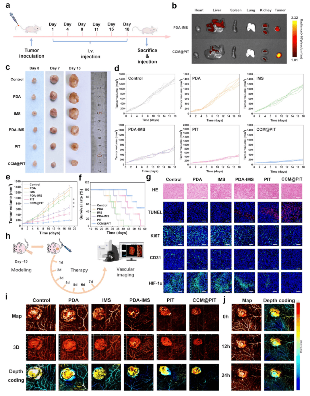 通过免疫组化、免疫荧光和血液生化实验发现CCM@PIT处理组的肿瘤抑制作用、存活率、Ki-67(肿瘤增殖标志物)等指标均有所改善,表明肿瘤生长受到抑制。此外,D31和HIF-1α的表达水平也显著下调,证实了体内血管生成被有效阻断(图6)。