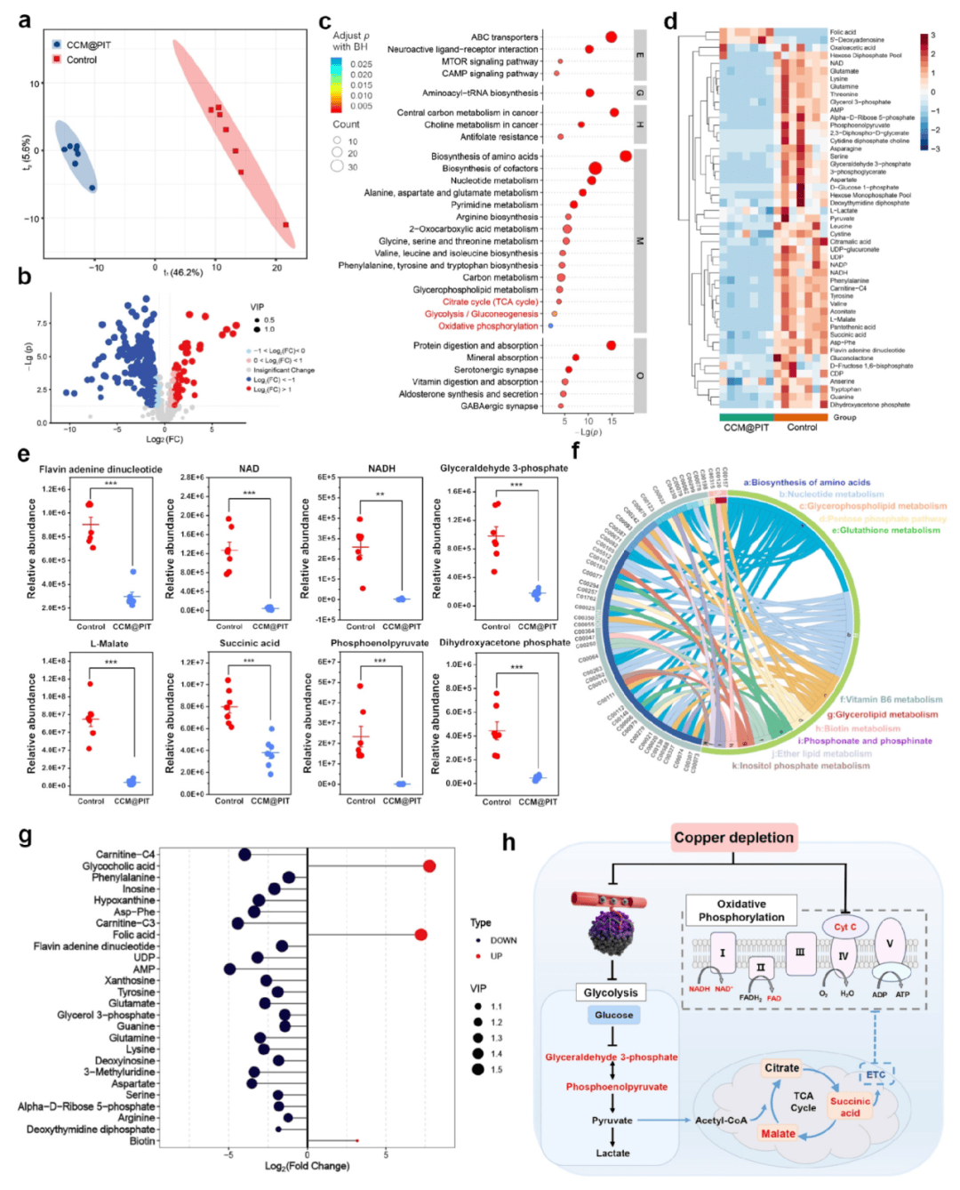 通过MT1000高通量靶向代谢组学分析,发现CCM@PIT显著抑制糖酵解代谢、三羧酸循环途径,并且对这两条途径中间产物的浓度测定呈现相同的结果。此外,CCM@PIT处理也显著降低了肿瘤的脂质、蛋白质等其他生物大分子合成的代谢途径。以上结果进一步证实CCM@PIT通过抑制TNBC依赖的OXPHOS代谢和阻断血管生成达到理想的肿瘤双重饥饿治疗效果(图5)。