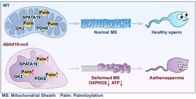 研究概述:男性不育症与精子线粒体结构与功能异常密切相关。拜谱生物蛋白质组与棕榈酰化修饰蛋白质组学揭示,S-脱棕榈酰化酶ABHD10作为线粒体基质蛋白,直接与线粒体鞘形成相关蛋白及有氧呼吸调控因子相互作用,并通过去棕榈酰化修饰稳定这些蛋白。该过程维持线粒体鞘的正常形态与线粒体氧化磷酸化功能,保障精子运动所需ATP的生成,为理解蛋白质棕榈酰化修饰在生殖系统中的功能提供了新视角。