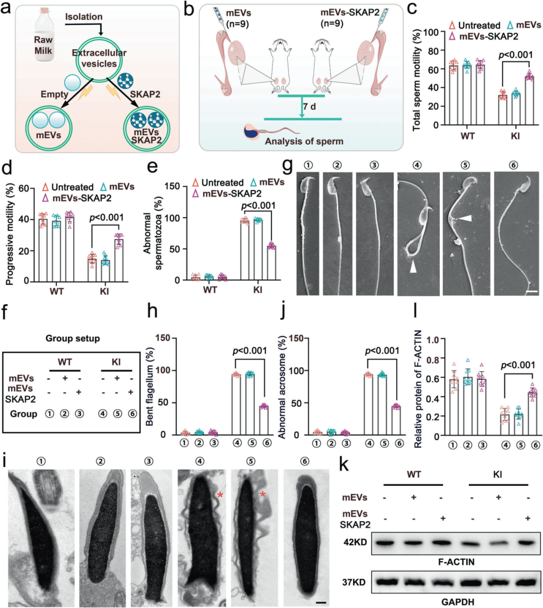 研究人员构建生殖细胞特异性Skap2敲除小鼠,发现SKAP2是精子功能和男性生育能力的关键调控因子,其缺失是弱畸精子症的核心致病环节。随后开发了牛奶来源的细胞外囊泡(mEVs)介导的SKAP2递送系统,体内体外实验均发现精子总活力、前向运动力均显著提升,该治疗方案具有明确的临床转化潜力。