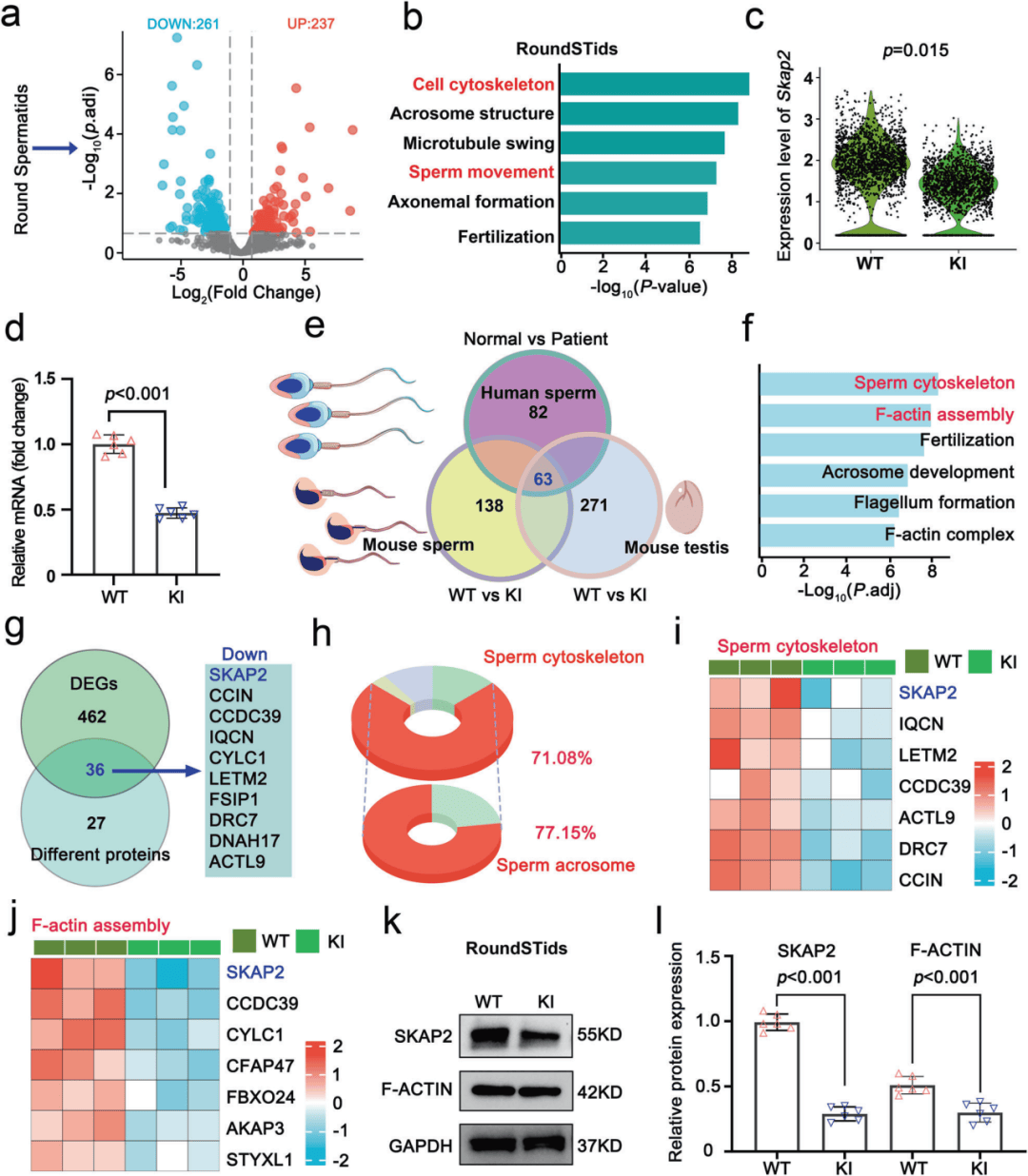 单细胞RNA测序显示,Hnrnpr KI小鼠圆形精子细胞中鉴定出498个差异表达基因。GO富集分析表明,差异基因主要富集于细胞骨架组织、精子运动、顶体形成等通路。其中,Skap2的mRNA水平仅为WT组的(35.6±4.2)%。蛋白质组学分析显示,人类和小鼠的精子、睾丸组织中,63个差异蛋白重叠,主要富集于精子细胞骨架和F-ACTIN组装通路,其中SKAP2是其中核心分子,其蛋白水平在KI小鼠中显著下调。