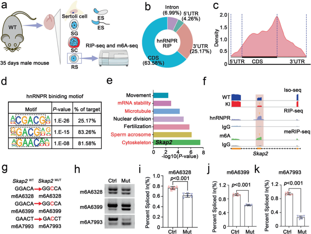 RNA免疫共沉淀测序显示hnRNPR结合的靶基因主要分布于编码区(63.58%)和3'UTR(25.17%),与m6A修饰位点分布高度重合;motif分析表明hnRNPR偏好结合CGACG、GGACG等m6A特征基序。IGV可视化显示,Skap2的剪接位点同时存在hnRNPR结合峰和m6A修饰峰。Minigene实验证实,突变Skap2的m6A位点会导致外显子2跳读比例显著增加,结果表明hnRNPR通过m6A依赖机制特异性调节Skap2转录本剪接,转录后通路功能障碍可能因Hnrnpr突变导致精子生成缺陷。