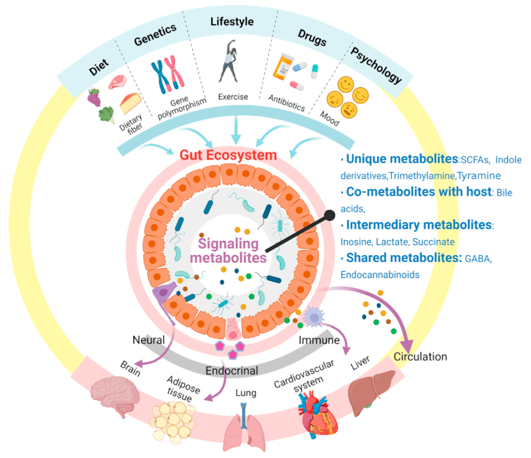 人体肠道内栖息着10¹³–10¹⁴个微生物细胞,其编码基因数量是人类自身基因组的100倍。这些"微小居民"不仅是消化助手,还可通过参与分泌合成短链脂肪酸、胆汁酸、神经递质等代谢物,与宿主进行持续对话,形成"肠-脑轴"、"肠-肝轴"、"肠-免疫轴"等调控网络。近年来,《Nature》、《Science》、《Cell》等顶刊频频揭示:肠道菌群代谢物是连接菌群结构变化与疾病表型的关键效应分子。