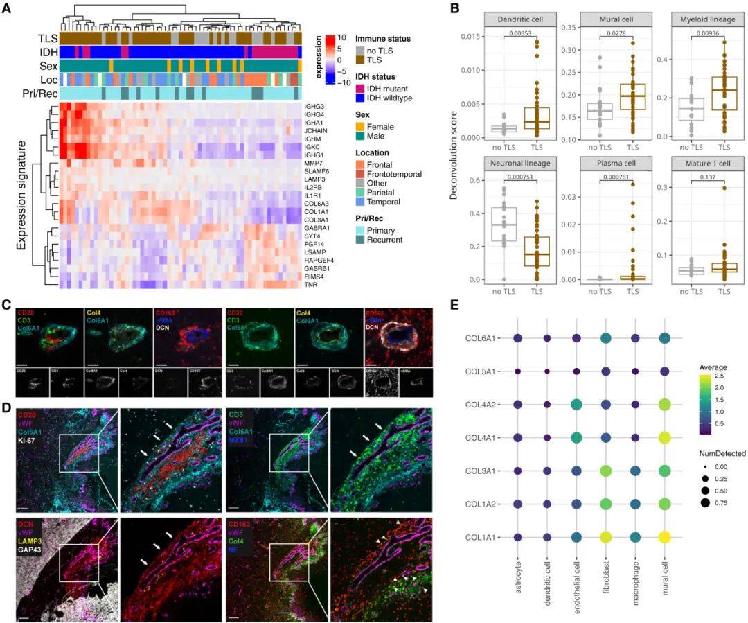 随后比较了TLS+和TLS-成人型弥漫性胶质瘤的转录谱,分析显示,TLS-肿瘤高表达神经元身份和突触功能相关转录本(如SYT4、TNR),而TLS+肿瘤富集B细胞/浆细胞相关转录本(如IGHG1、IGHA1)、以及干扰素和白细胞介素信号相关转录本(如IL2RB、IL1R1),通过转录细胞类型解卷积,作者发现TLS+肿瘤中免疫细胞(树突状细胞、浆细胞、髓系细胞)总体富集。