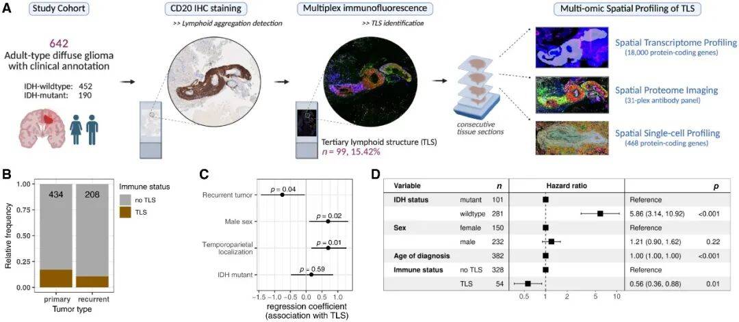 研究团队对642例成人型弥漫性胶质瘤(含452例IDH野生型和190例IDH突变型)进行系统筛选,通过免疫组化、空间转录组、多重免疫荧光等多模态技术,明确TLSs存在于15%的肿瘤中(即TLS+胶质瘤)。这些结构主要分布在肿瘤实质和软脑膜区域,且在原发肿瘤中的患病率略高于复发肿瘤。