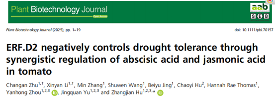 近期,浙江大学喻景权院士团队,朱常安博士在Plant Biotechnology Journal期刊上发表题为“ERF.D2 negatively controls drought tolerance through synergistic regulation of abscisic acid and j...