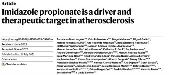 心血管疾病(CVD)是全球死亡的主要原因,动脉粥样硬化是其主要决定因素。2025年7月16日,西班牙卡洛斯三世国家心血管研究中心(CNIC)David Sancho团队在Nature(48.5)杂志上发表了题为“Imidazole propionate is a driver and therapeutic target in atherosclerosis”的研究文章,揭示了肠道菌群代谢产物丙酸咪唑(ImP)通过激活髓...