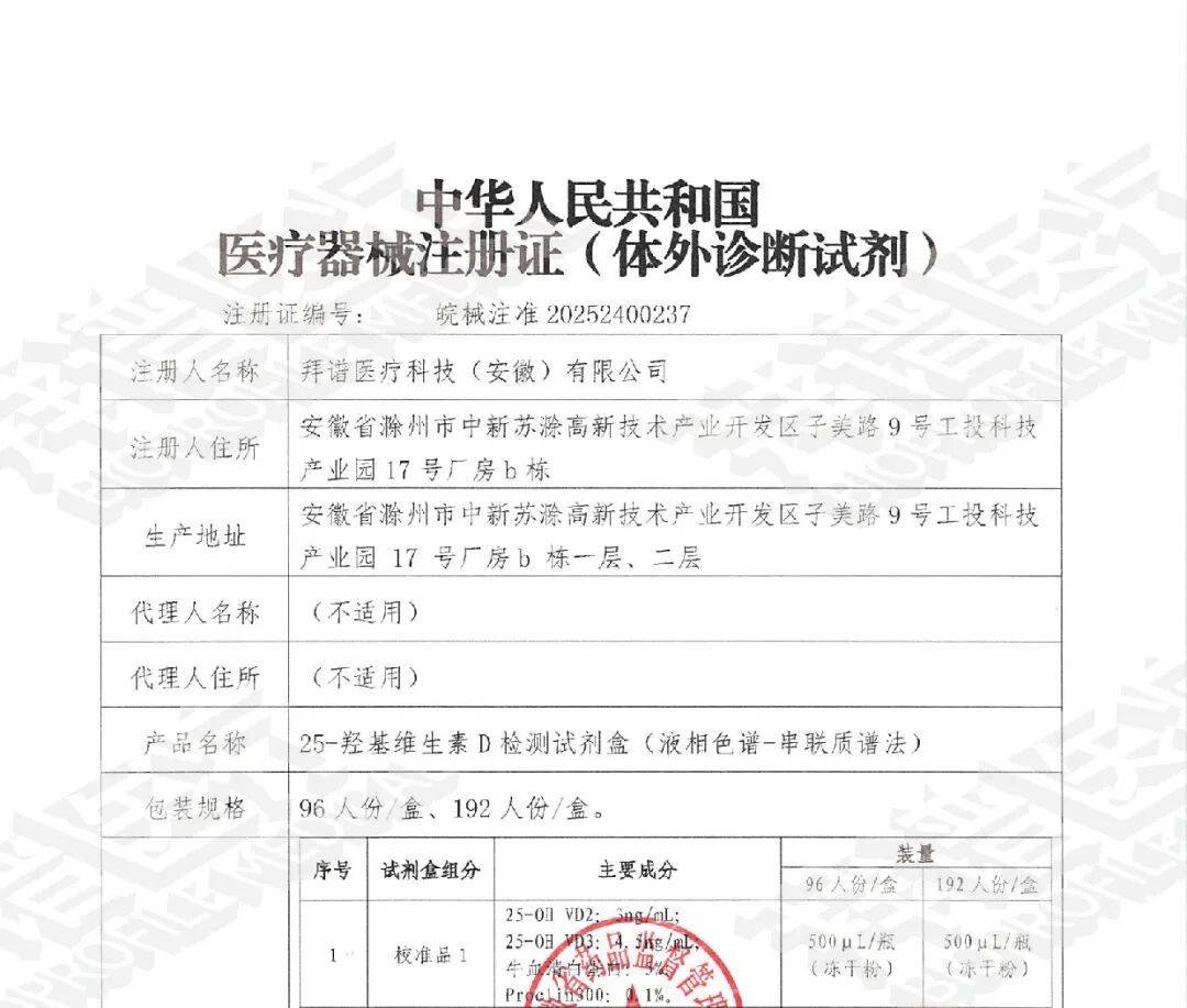 近日,上海拜谱生物科技有限公司全资子公司 —— 拜谱医疗科技(安徽)有限公司(以下简称 “拜谱医疗”)自主研发的核心产品——25 -羟基维生素D检测试剂盒(液相色谱-串联质谱法),正式获得安徽省药品监督管理局颁发的二类医疗器械注册证(注册证号:皖械注准 20252400237)!此次获批,标志着该产品在精准性、稳定性及临床应用价值上达到行业严苛标准,是对拜谱医疗研发实力与质量管控体系的权威认可,也为临床维生素D营养状态评估提供了更可靠的检测方案!