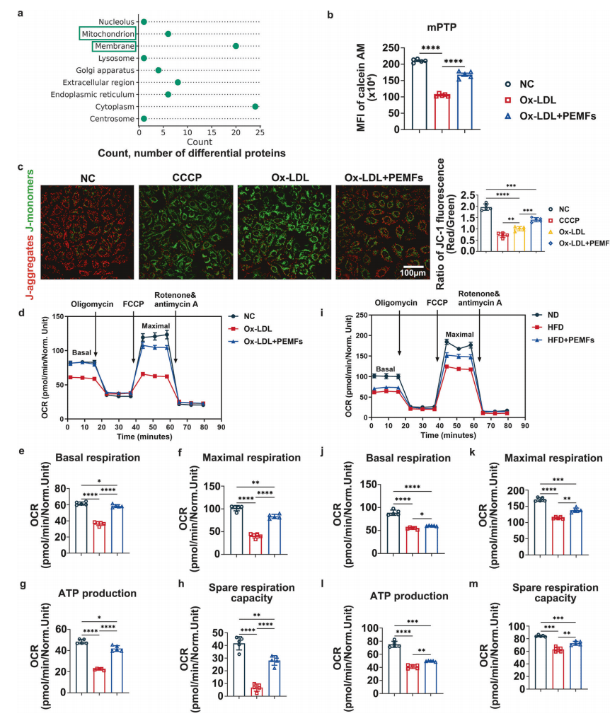 前期研究证实,NLRP3下调可保护细胞,其上调加剧ECs损伤。为明确PEMFs对特定细胞内过程的调控机制,现有研究及人类蛋白质组数据提示:冠心病患者亚细胞水平以线粒体/细胞膜改变为显著特征,且线粒体功能障碍驱动内皮炎症(图3a)。功能检测证实,PEMFs可抑制mPTP开放、恢复线粒体膜电位,改善HUVECs与MVECs线粒体呼吸功能(图3b-m)。