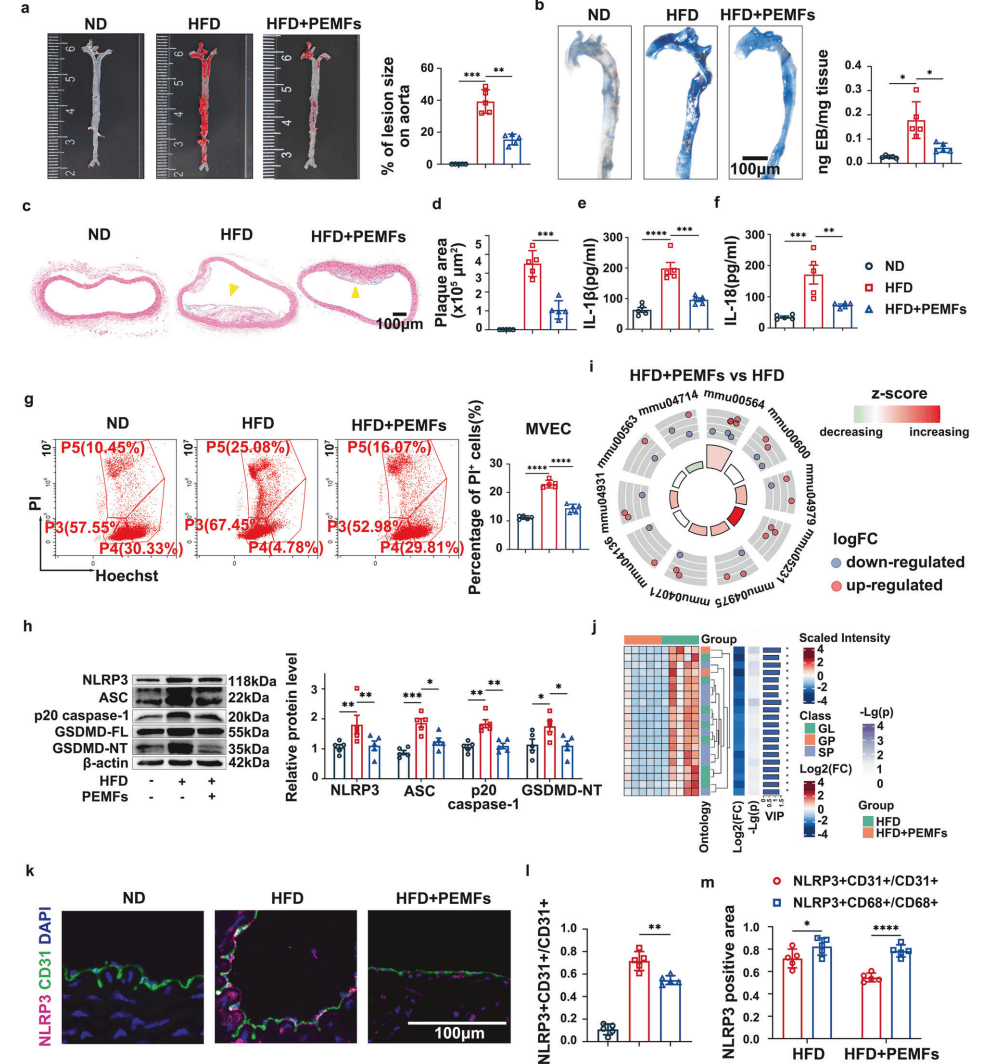 PEMFs抑制ApoE-/-小鼠动脉粥样硬化进展:减少病灶负担、降低血管通透性、缩小主动脉弓斑块(图1a-d),与NLRP3炎症小体通路的选择性下调有关(图1e-h),且显著减少小鼠血管内皮细胞(MVEC)焦亡(图1g)。非靶向脂质组学分析结果表明PEMFs主要调节甘油磷脂和胆固醇代谢(图1i-j)。临床层面上,冠心病患者与对照组的DIA蛋白质组学分析显示,冠心病患者NLRP3炎症小体、IL-18受体复合体等通路显著富集,进一步证实ECs是PEMFs靶向NLRP3抗炎的核心细胞介质(图1k-m)。