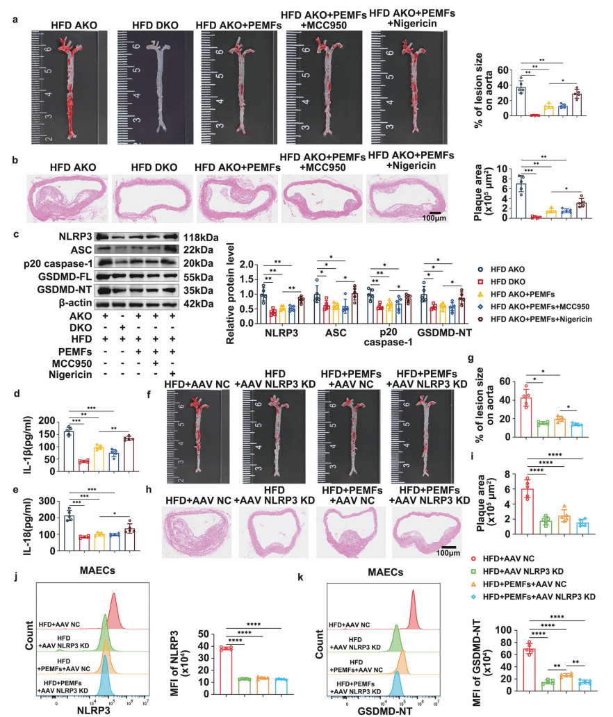 为明确NLRP3在PEMFs抗动脉粥样硬化中的作用,研究采用ApoE-/-NLRP3-/-双敲除(DKO)小鼠,同时在ApoE-/-(AKO)小鼠中用MCC950(抑制剂)、Nigericin(激动剂)调控NLRP3活性。结果证实NLRP3是AS关键驱动因子:Nigericin激活NLRP3会削弱PEMFs保护作用,增加病灶负担、斑块面积及血管通透性(图2a-b),上调NLRP3炎症小体成分与GSDMD-NT表达,促进促炎因子分泌并加重血脂异常(图2c-e);MCC950抑制NLRP3可模拟PEMFs益处。此外,AAV介导的ECs靶向NLRP3敲低进一步明确其内皮特异性作用(图2f-k)。