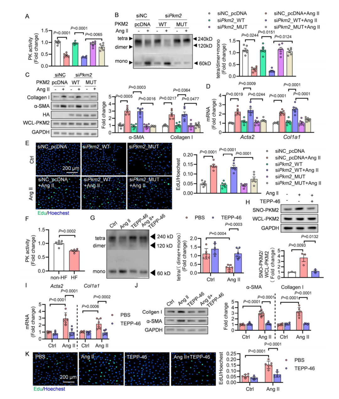 通过液相色谱-串联质谱分析,精准鉴定PKM2的半胱氨酸49(Cys49)和326(Cys326)为SNO修饰关键位点。功能验证显示,沉默内源性PKM2后,通过表达Cys49/326S双突变体(MUT)可完全阻断AngII诱导的SNO-PKM2升高,并抑制CFs激活标志物α-SMA表达,且不影响基线状态下PKM2的四聚化和酶活性。