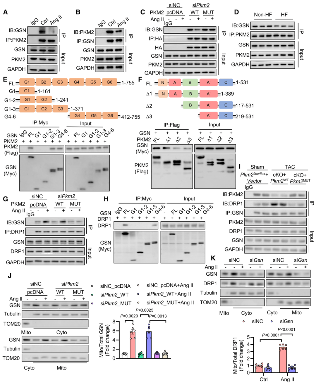 通过免疫共沉淀结合质谱分析,筛选出与PKM2相互作用的凝溶胶蛋白(GSN)为核心下游分子。实验证实,AngII刺激后,PKM2与GSN结合减弱,GSN与动力相关蛋白1(DRP1)结合增强。机制上,SNO-PKM2通过降低PKM2四聚化,释放GSN,促进DRP1-S616位点磷酸化及线粒体转运,引发线粒体过度分裂,最终激活CFs。敲低GSN或抑制CaMKII可阻断该过程,逆转纤维化表型。