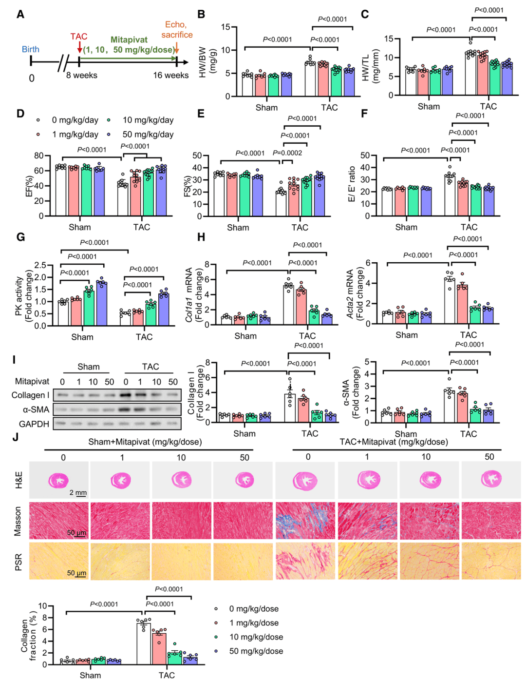 体外实验显示,mitapivat剂量依赖性升高PKM2活性,降低纤维化标志物表达;体内实验中,TAC小鼠给予mitapivat(10/50mg/kg,每日两次)后,心脏功能、心肌肥大及纤维化均显著改善(P<0.0001),高剂量可使EF、FS接近正常水平。此外,mitapivat兼具预防(TAC后立即给药)和治疗(TAC后2周给药)作用,且无明显肝肺肾副作用。