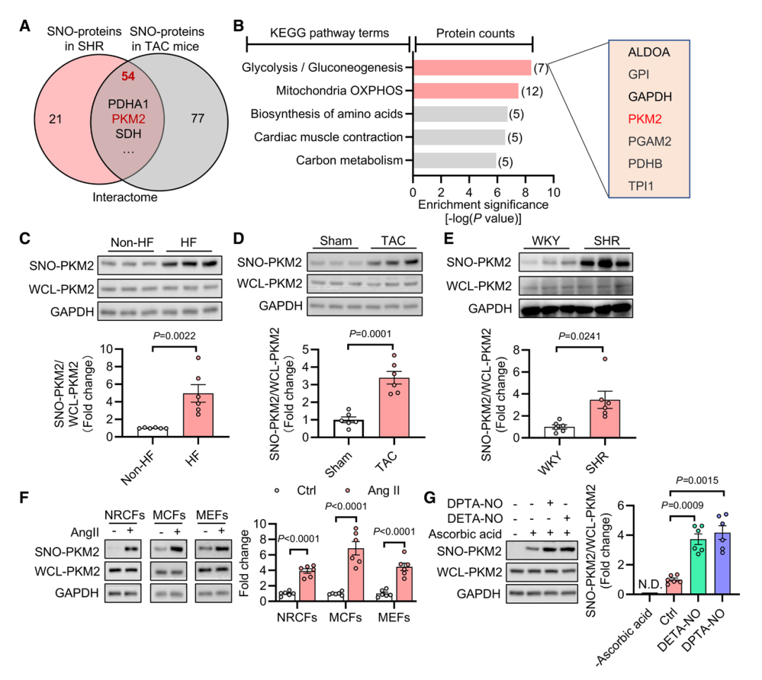 研究通过S-亚硝基化修饰蛋白质组学分析,从横向主动脉缩窄(TAC)小鼠、自发性高血压大鼠心脏组织中,鉴定出54个共同S-亚硝基化蛋白,其中PKM2因仅高表达于CFs、心肌细胞中未检测到,成为核心研究对象。验证显示,心衰患者心肌组织中SNO-PKM2水平显著高于非心衰供体;TAC小鼠、血管紧张素II(Ang II)刺激的CFs中,SNO-PKM2均明显升高,NO供体可直接诱导其升高,抗坏血酸能逆转该效应,证实NO是修饰来源。这一发现首次明确SNO-PKM2是心肌纤维化的特异性修饰蛋白,为机制研究锁定核心靶点。
