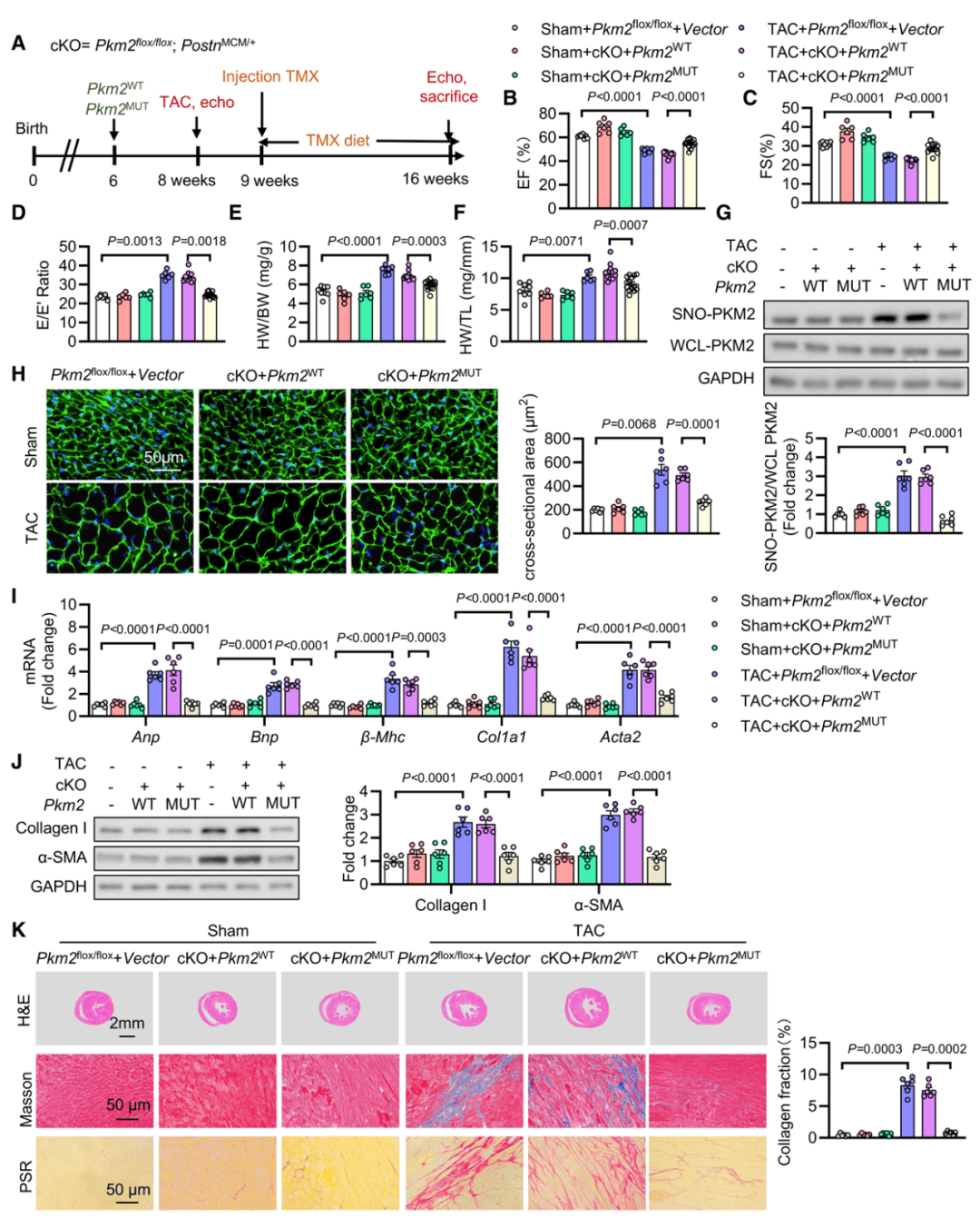构建CFs特异性PKM2条件性敲除(cKO)小鼠,TAC手术后发现:cKO小鼠心脏收缩/舒张功能恶化(EF、FS降低,E/E’升高),心肌肥大、胶原沉积显著增加,证实CFs中PKM2缺失加重纤维化。向cKO小鼠转染SNO抵抗型PKM2双突变体后,上述病理表型均显著逆转,而转染野生型PKM2无此效果,同时心肌组织中SNO-PKM2水平、线粒体分裂程度恢复正常。
