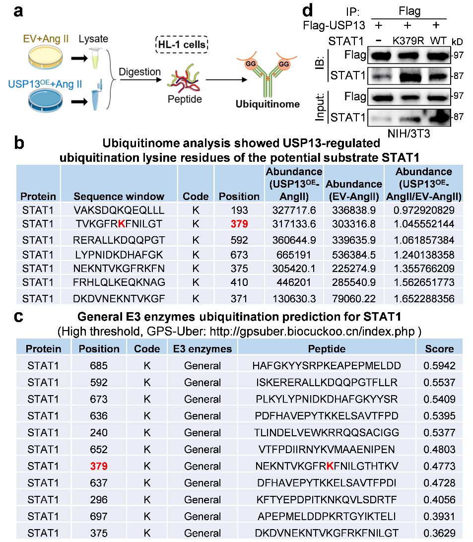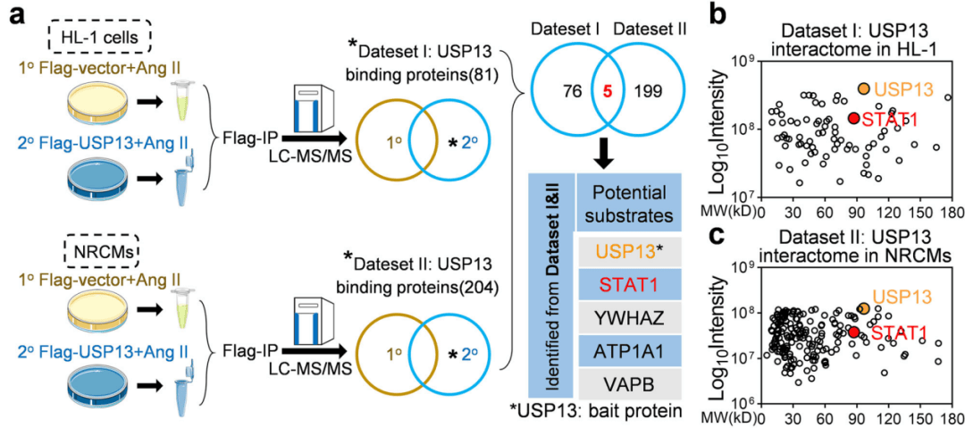 研究人员探究USP13对心肌细胞的影响发现USP13敲除加重心脏肥大表现。泛素化通过修饰底物蛋白来实现其特定功能,为了寻找其潜在底物,研究人员用IP-MS分析发现81种在HL-1细胞中与USP13物理相互作用的蛋白质,进一步分析确认USP13在心肌细胞中直接结合STAT1蛋白并且通过防止STAT1降解来提高STAT1水平(图2)。